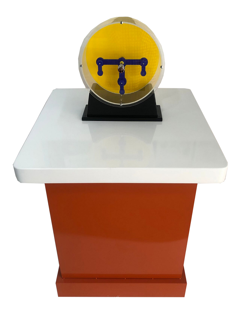三、功能概述:展品由箱體、圓錐體和刻度盤(pán)組成。圓錐曲線是到頂點(diǎn)的距離與到定直線的距離的比為常數(shù)的點(diǎn)的軌跡。圓錐曲線包括圓、橢圓、雙曲線和拋物線。通過(guò)一個(gè)平面截取圓錐面,截取角度不同,它們的交線會(huì)形成不同的圓錐曲線。在日常生活中,我們利用拋物線的性質(zhì)設(shè)計(jì)太陽(yáng)灶。宇宙中天體的運(yùn)行軌跡則為橢圓形。