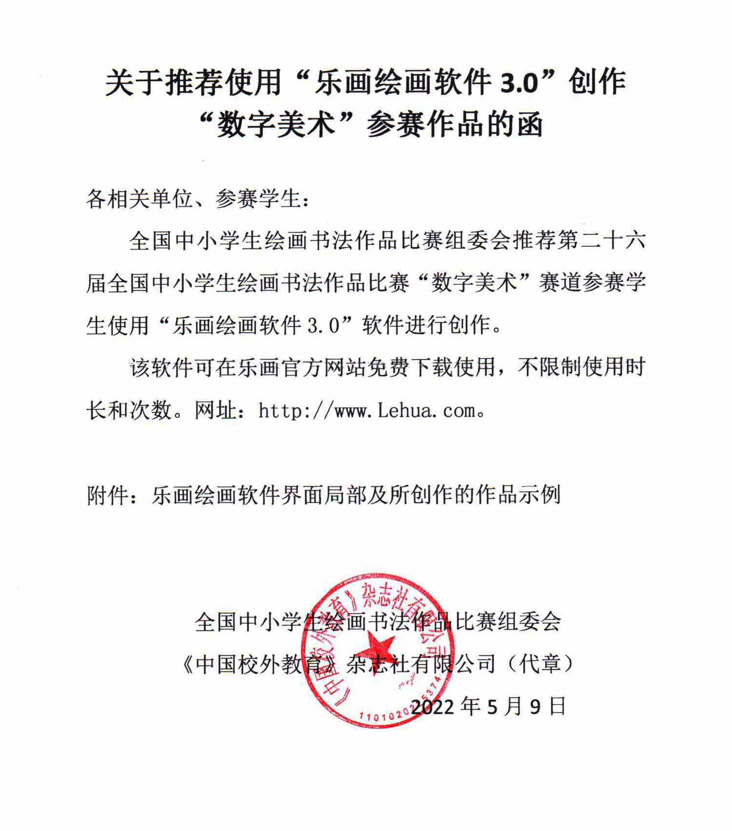 全國中小學(xué)生繪畫書法作品比賽組委會推薦第二十六屆全國中小學(xué)生繪畫書法作品比賽“數(shù)字美術(shù)”賽道參賽學(xué)生使用“樂畫繪畫軟件3.0”軟件進行創(chuàng)作。