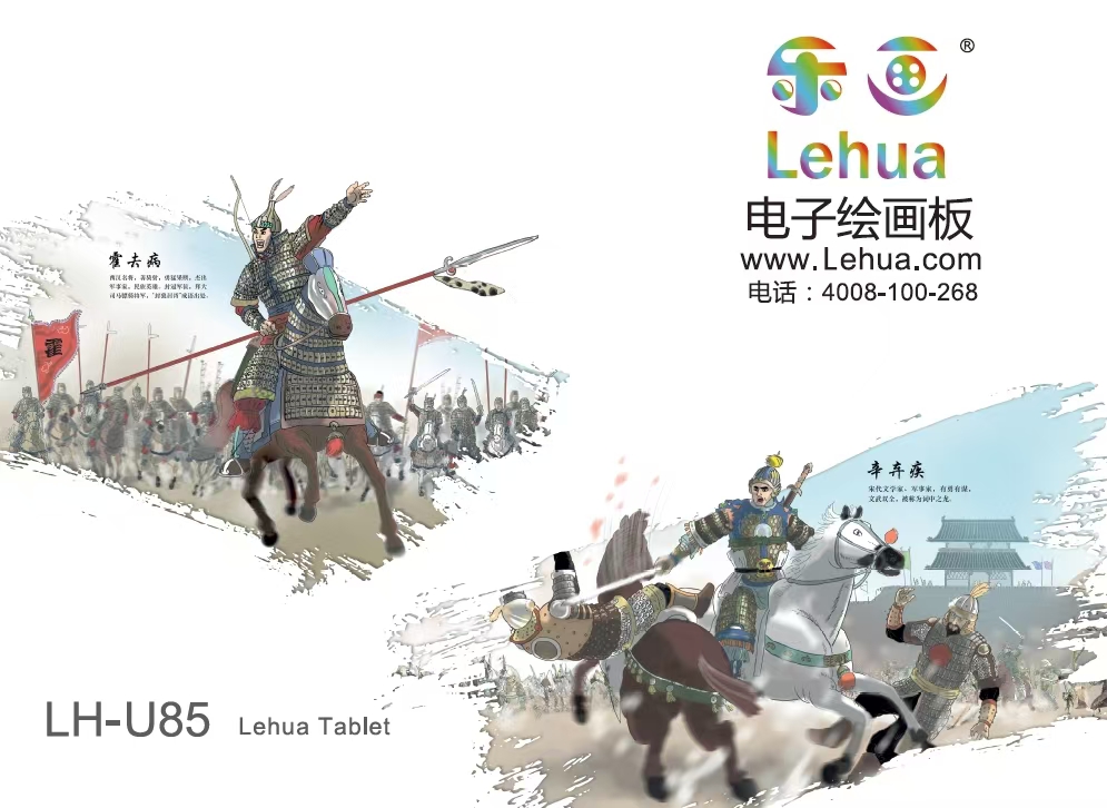 樂畫LH-U85產(chǎn)品封面特別設(shè)計了中國英雄人物——霍去病和辛棄疾。人物繪畫則是由康智達公司總經(jīng)理特別邀請中國藝術(shù)研究院藝術(shù)學(xué)研究所文化人類學(xué)專業(yè)的副研究員侯百川先生創(chuàng)作繪制。侯百川先生還熱心為廣大師生朋友在花紙上簽名。