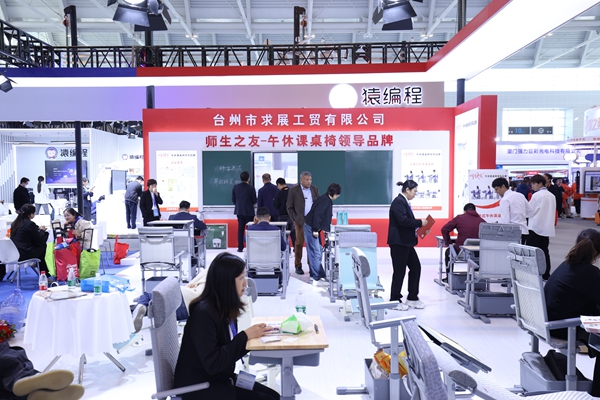 本屆展會,求展帶來“師生之友”午休課桌椅,它改變了傳統(tǒng)課桌椅固定的水平桌面,設(shè)計了桌面傾斜功能,輕輕一按,水平桌面就變成了傾斜桌面,操作簡單安全,如此一來桌子即可變形為學(xué)習(xí)桌、考試桌、畫桌、躺板等多種模式。桌椅還可自行調(diào)整高度,根據(jù)學(xué)生的不同身高情況,調(diào)整到適合的高度,改變了傳統(tǒng)課桌椅高度不能調(diào)節(jié)而無法匹配學(xué)生身高的弊端,課桌椅高度與學(xué)生身高的匹配,能夠有效避免了學(xué)生不良坐姿,呵護(hù)脊椎的健康發(fā)育。