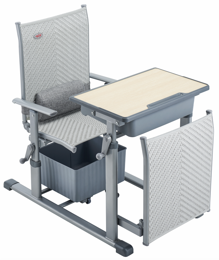 4、課椅規(guī)格及材料:寬460mm*深380mm*(座椅面高420mm-460mm可手搖升降調(diào)節(jié))±5mm,椅背可調(diào)最大傾斜度150°。座靠面料采用環(huán)保PE藤質(zhì)材料。課椅座面前部背面設置寬70mm的丙綸絲編織加強帶,增強課椅座面的承受力。椅下設置370*330*190mm±3mm的PP材料的貯物箱,貯物箱底下前部設置雙滑輪,后部設置滑塊,與課椅下雙滑軌(ABS材質(zhì),規(guī)格315*30*20mm)的卡位裝置結(jié)構(gòu)配合,貯物箱可前后自由限位滑動,可脫卸。