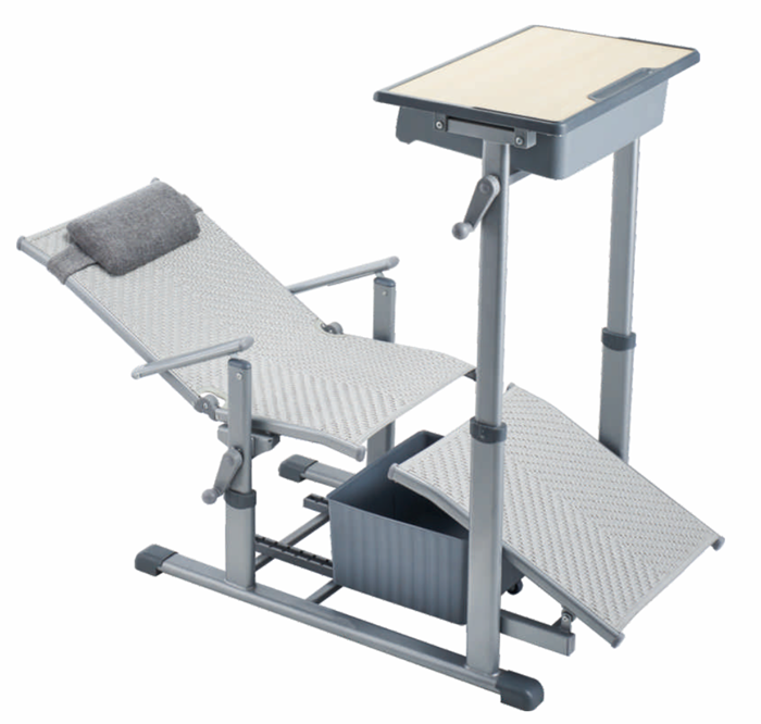 3、課斗規(guī)格:350mm*450mm*100mm±3mm,PP塑料一次成型,課斗可水平前后活動80mm,課桌底下前部設置藤質(zhì)躺板。