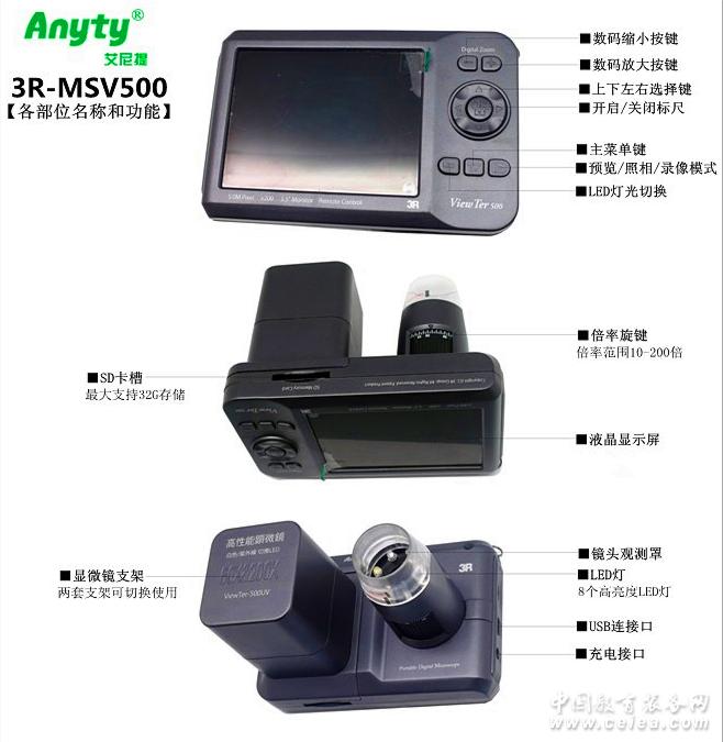 產(chǎn)品特征 » ◆ 便攜式視頻顯微鏡不需要跟傳統(tǒng)顯微鏡一樣更換鏡頭,不需要電腦輔助即可實(shí)現(xiàn)10-200倍放大,微觀(guān)畫(huà)面直接在顯示屏上面直接觀(guān)測(cè)、拍照。 ◆ 高達(dá)500萬(wàn)象素高清鏡頭,畫(huà)面成像效果更加細(xì)膩,配合強(qiáng)大內(nèi)置軟件功能(顯示畫(huà)面效果調(diào)節(jié)、十字刻度、防抖動(dòng)、成像圖片大。,輕松實(shí)現(xiàn)各種不同模式觀(guān)測(cè)效果。 ◆ 8個(gè)內(nèi)置的LED燈始終提供均勻明亮的觀(guān)測(cè)光線(xiàn),而且可根據(jù)使用情況調(diào)節(jié)亮度。(可以根據(jù)客戶(hù)需求,定制紫外/紅外燈光實(shí)現(xiàn)特種需求) 產(chǎn)品配件 » Anyty便攜式數(shù)碼顯微鏡MSV500IR/UV配件如下: 項(xiàng)目 數(shù)量 Anyty MSV500顯微鏡 1 交流電源適配器 DC 5V/1A 1 說(shuō)明書(shū) 1 相機(jī)掛繩 1 可充電鋰電池(已插入相機(jī)) 1 測(cè)量軟件光盤(pán) 1 USB 充電線(xiàn) 1 可疊加式電池蓋支架 1 支架疊加塑料墊子(60x & 200x and 80x & 150x) 2 USB 2.0 線(xiàn) 1 輔助焦距透明件(60x & 200x and 80x & 150x) 2 保護(hù)布包 1 線(xiàn)控拍照控制器 1 塑料校正尺 1 2G或4G SD Card(選配) 1 (第一次使用或長(zhǎng)時(shí)間未使用iSCope相機(jī),請(qǐng)給相機(jī)電池充電.充滿(mǎn)電池大約需要4個(gè)小時(shí).如果長(zhǎng)時(shí)間不使用iScope相機(jī),,請(qǐng)每4個(gè)月充飽一次電池,否則相機(jī)長(zhǎng)時(shí)間待機(jī)會(huì)導(dǎo)致電池過(guò)渡放電而損壞.)