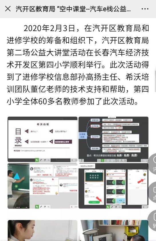 在疫情突襲的停課期間,汽開區(qū)內的小學依托“希沃白板5”軟件或云課堂功能,實現(xiàn)了掃碼即入、畫面高清、語音清楚、在線互動高效的設計預期,構建了師生面對面、指導零距離、離校不離教、下課不下線的網絡互動學習環(huán)境。同時,汽開區(qū)“汽車e棧”團隊面向長春車城子弟,率先開啟利用希沃云課堂進行“空中課堂”公益活動。