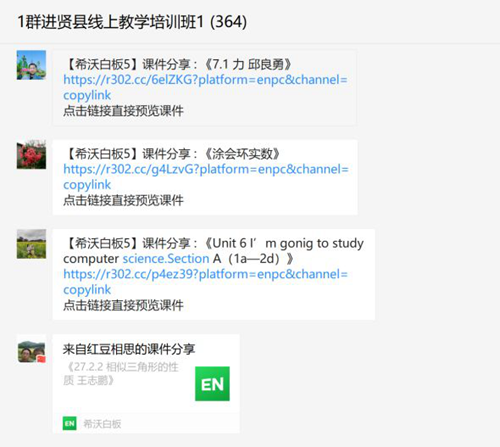 全縣參訓(xùn)的5000余名教師被分流到11個臨時組建的微信群。每個群中,由希沃講師專門運(yùn)營,并以直播教學(xué)、微信群交流答疑的方式進(jìn)行培訓(xùn)。參訓(xùn)的教師們認(rèn)真聽講、熱烈討論,課后及時進(jìn)行實踐操作,按時完成每堂課的作業(yè)。尤其是很多年齡偏大的教師,對于這些現(xiàn)代化的教學(xué)手段不甚熟悉,但他們克服重重困難,好學(xué)好問,在希沃講師們的熱心幫助下,順利通過培訓(xùn)考核。