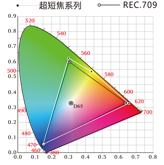 色彩顯示區(qū)域高于REC.709色域標準,理論值可滿足自然界中90%以上的人眼可識別色彩。