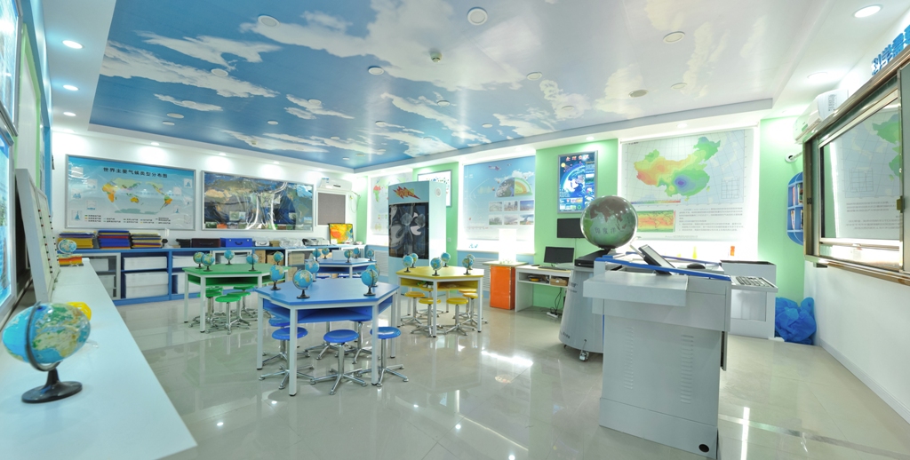 自然地理教室從整體到局部,側(cè)重地球內(nèi)外力作用的表現(xiàn)及水圈的基本特點(diǎn),主墻面:兩幅彩色語(yǔ)音地圖(中國(guó)和世界)莊嚴(yán)大氣,海量信息,滿(mǎn)足學(xué)生查詢(xún)需求,頂部:長(zhǎng)江、黃河兩條巨龍蜿蜒奔騰,側(cè)墻上:地球內(nèi)外力作用的具體表現(xiàn)歷歷在目,展柜上18種地貌模型形象生動(dòng),同學(xué)們可以把自己的觀察結(jié)果與現(xiàn)實(shí)生活相結(jié)合,運(yùn)用3D打印技術(shù),把家鄉(xiāng)的地貌景觀打印成模型和同學(xué)們分享。擺放在教室中部的兩臺(tái)大型試驗(yàn)設(shè)備“水土流失試驗(yàn)臺(tái)和地質(zhì)構(gòu)造形成過(guò)程試驗(yàn)臺(tái)”,可以模仿或再現(xiàn)水土流失、不同構(gòu)造地貌的形成過(guò)程,如果改變實(shí)驗(yàn)參數(shù)、實(shí)驗(yàn)條件等能夠得出多種不同的結(jié)論。通過(guò)參與實(shí)驗(yàn)活動(dòng),不但能激發(fā)學(xué)科興趣,幫助學(xué)生們理解、鞏固學(xué)科專(zhuān)業(yè)知識(shí),培養(yǎng)嚴(yán)謹(jǐn)?shù)目茖W(xué)態(tài)度和科學(xué)素養(yǎng),而且有助于學(xué)生們正確認(rèn)識(shí)地理環(huán)境各要素之間相互影響、制約的微妙關(guān)系,從而深刻理解自然地理環(huán)境具有整體性與差異性的顯著特點(diǎn)。