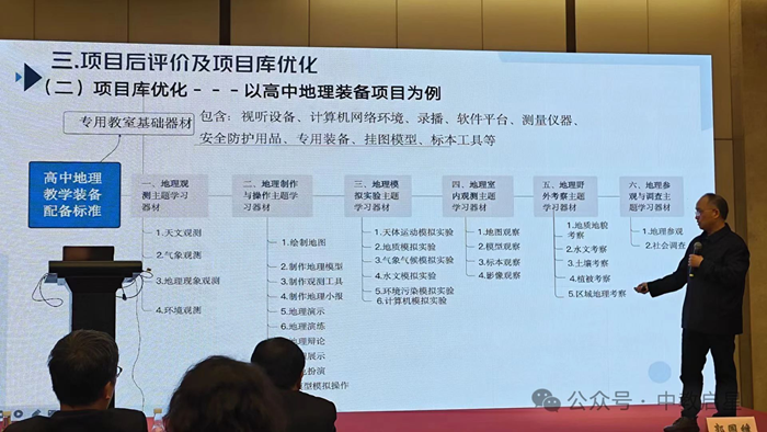 而項(xiàng)目庫(kù)優(yōu)化的案例則是以“高中地理裝備”為例,因?yàn)槟壳暗乩韺?shí)驗(yàn)裝備的發(fā)展相對(duì)理化生實(shí)驗(yàn)設(shè)備來(lái)說,有其獨(dú)特的學(xué)科特征和裝備普及階段。所以,他的建議是: