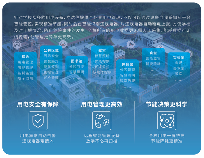 立達(dá)信面向全校提供全校物聯(lián)智控光環(huán)境,針對(duì)眾多的用電設(shè)備,提供全場(chǎng)景用電管理,不僅可以通過設(shè)備自我感知及平臺(tái)智能管控,實(shí)現(xiàn)精準(zhǔn)節(jié)能,同時(shí)通過AI電流指紋算法技術(shù),智能識(shí)別違規(guī)電器,對(duì)違規(guī)電器自動(dòng)斷電上報(bào),方便學(xué)校及時(shí)了解情況,防止危險(xiǎn)事件的發(fā)生,全校所有的用電數(shù)據(jù)更無需人工采集,能耗數(shù)據(jù)可無線傳輸,讓管理更簡(jiǎn)單更高效。