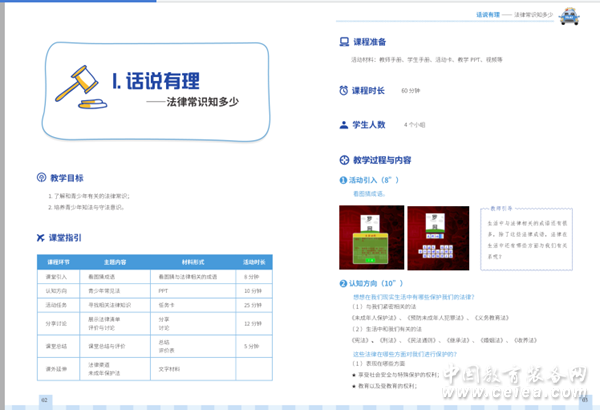依據(jù)青少年認知發(fā)展水平,通過課程增強學生的知法意識、守法意識、法制自我保護意識、法制防范意識以及樹立用法律手段處理現(xiàn)實問題的意識等。希望青少年在知法、守法的基礎上,能以法制的觀點去看待和解決生活中遇到的法律問題,通過課堂觀察和實踐,初步形成運用法律手段維護自身合法權(quán)利的能力,而最終將法制意識內(nèi)化于心,外化于行,為健全人格和他們未來的和諧發(fā)展奠定基礎。