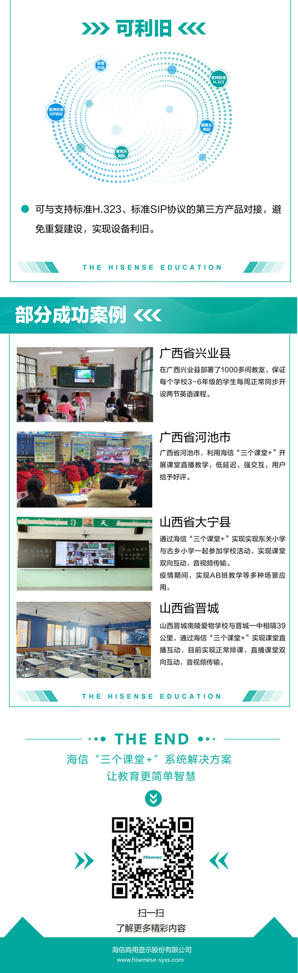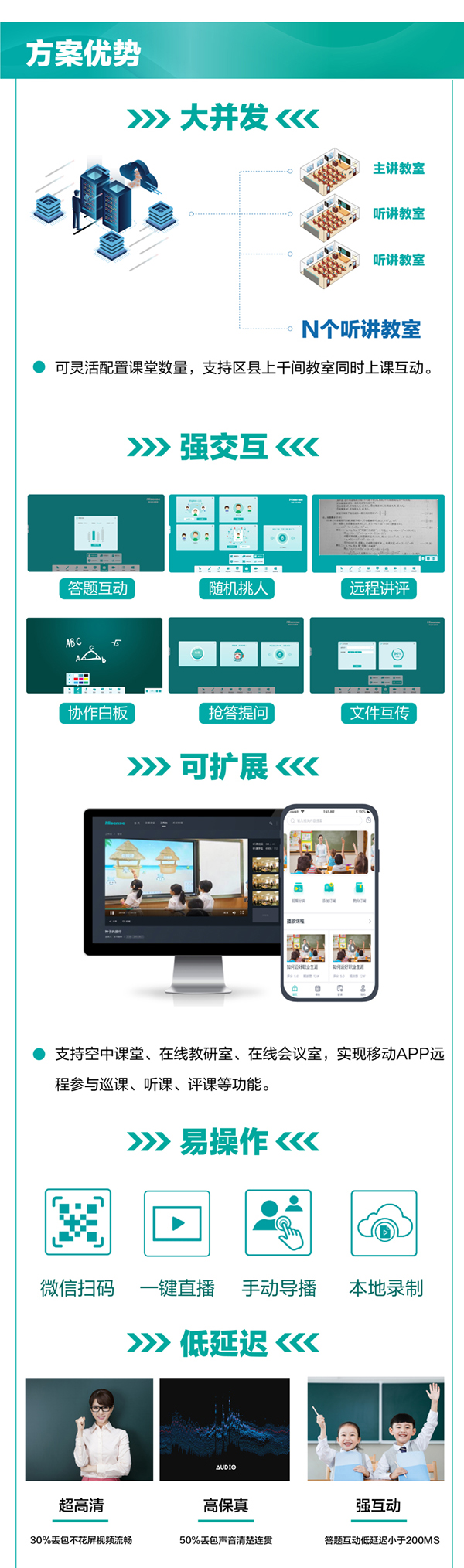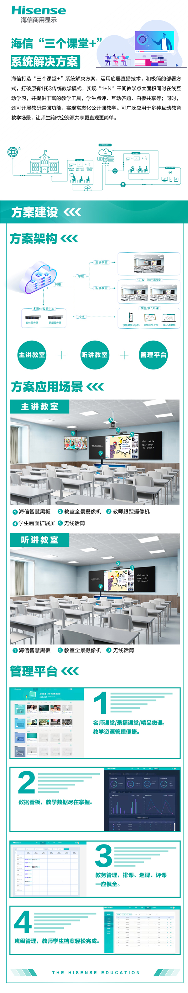 基于“三個(gè)課堂”教育政策基礎(chǔ)下的海信“三個(gè)課堂+”系統(tǒng)解決方案。全新的海信“三個(gè)課堂+”系統(tǒng)解決方案打破傳統(tǒng)“1托3”限制,建立多間“1托N”教學(xué)子系統(tǒng),區(qū)域間可實(shí)現(xiàn)千間教室同時(shí)在線互動(dòng)學(xué)習(xí)。該方案不僅可滿足專遞課堂,名師課堂、名校網(wǎng)絡(luò)課堂的“三個(gè)課堂”的場(chǎng)景應(yīng)用,同時(shí)也可滿足遠(yuǎn)程會(huì)議、空中課堂、在線教研、“四點(diǎn)半工程”、巡課督導(dǎo)等應(yīng)用需求。最新版本還創(chuàng)新性的提供了“遠(yuǎn)程講評(píng)”“答題互動(dòng)”等功能,搭配協(xié)作白板、隨機(jī)挑班、搶答等互動(dòng)工具,打造趣味性課堂互動(dòng)模式,讓主講老師充分關(guān)注到聽講班級(jí)的每位學(xué)生,即使相隔千里,猶如置身同一課堂。