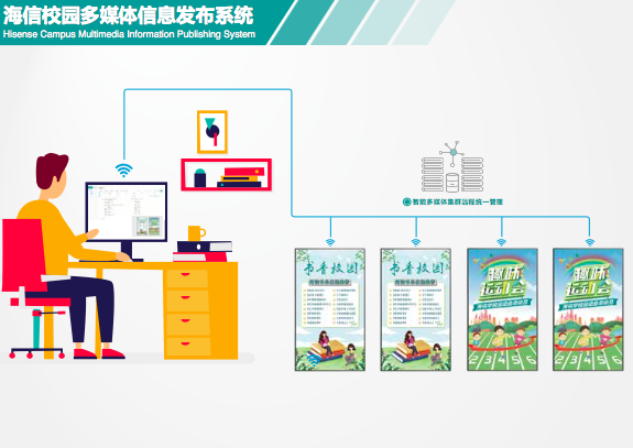 海信校園多媒體信息發(fā)布系統(tǒng),為用戶提供校園信息文化,節(jié)目制作發(fā)布平臺。平臺可進(jìn)行校 園多媒體統(tǒng)一發(fā)布信息,文本,節(jié)目終端發(fā)送,統(tǒng)一管理,為構(gòu)建校園文化信息展示助力。系統(tǒng)部署方便,快捷,通過網(wǎng)頁或移動端即可登錄操 作使用,讓管理不再局限。持對不同類型素材上傳,對圖片、視頻、音樂等進(jìn)行分類 管理,滿足學(xué)校個性化宣傳需求。上傳,下載采用先進(jìn)技術(shù),支持超大、超高清視頻穩(wěn) 定上傳和下載,為使用者帶來便利,節(jié)省時間。所有操作都可通過靜默采集,直接形成可視化數(shù)據(jù)報表, 利于管理者分析統(tǒng)計數(shù)據(jù)。