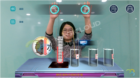 物理仿真實(shí)驗(yàn)室,綜合應(yīng)用AI和AR技術(shù),通過(guò)3D建模虛擬再現(xiàn)真實(shí)的實(shí)驗(yàn)場(chǎng)景,借助先進(jìn)的體感交互設(shè)備Kinect進(jìn)行虛實(shí)互動(dòng),將真實(shí)的實(shí)驗(yàn)者與虛擬仿真的實(shí)驗(yàn)器材結(jié)合到一個(gè)畫(huà)面里,實(shí)驗(yàn)者實(shí)現(xiàn)無(wú)需佩戴任何體感設(shè)備,純手勢(shì)就可以進(jìn)行實(shí)驗(yàn)互動(dòng)教學(xué)。