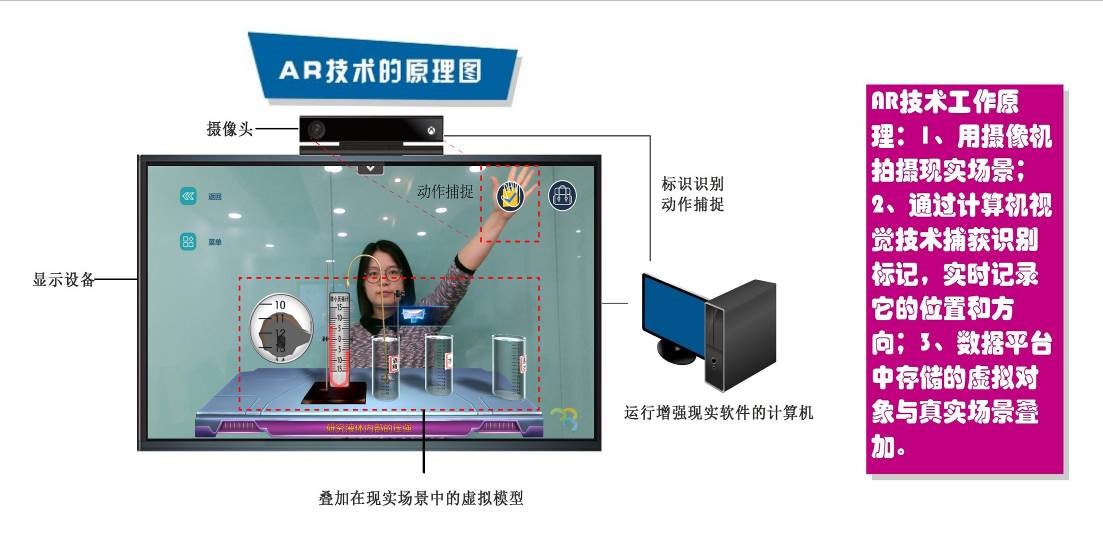 隨著信息技術(shù)發(fā)展,觸控一體機(jī)及投影等顯示設(shè)備作為主要的輔助教學(xué),大大提高了教學(xué)質(zhì)量。AR理化生地仿真實(shí)驗(yàn)系統(tǒng)在學(xué)校教學(xué)裝備上錦上添花,將動(dòng)態(tài)捕捉攝像機(jī)布置在計(jì)算機(jī)顯示器支架上,鏈接觸控一體機(jī)、投影等硬件顯示設(shè)備,即可完成實(shí)驗(yàn)教學(xué)所需環(huán)境,在系統(tǒng)中選取授課內(nèi)容完成教學(xué),教師在講授理論知識(shí)的同時(shí)運(yùn)用該產(chǎn)品給學(xué)生清晰明確的實(shí)驗(yàn)過程,通過重復(fù)性實(shí)驗(yàn)大量數(shù)據(jù)積累得出正確結(jié)論,吸引學(xué)生注意力,學(xué)生也可自己操作進(jìn)行實(shí)驗(yàn),記憶深刻。從根本上釋放教師教學(xué)壓力,積極調(diào)動(dòng)學(xué)生學(xué)習(xí)主動(dòng)性。