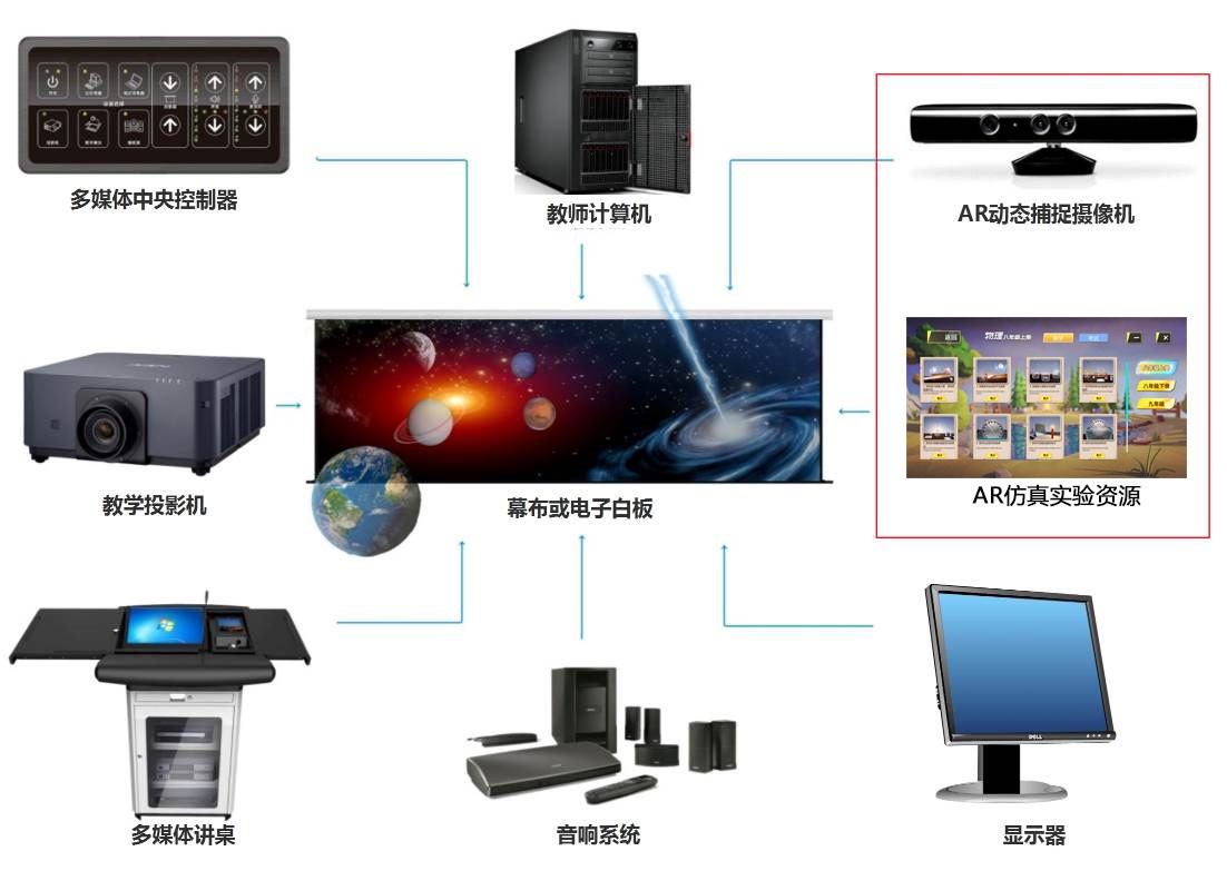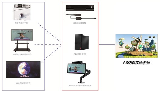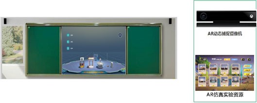 因此,AR理化生地仿真實(shí)驗(yàn)平臺(tái)的搭建非常便利,需要做的只是選擇一間常規(guī)多媒體教室或功能教室(教學(xué)場地),現(xiàn)有教學(xué)設(shè)施(或新建)包括一臺(tái)亮度適中的投影機(jī)、幕布或電子白板、教師計(jì)算機(jī)、電子講桌、音響等(多媒體設(shè)備),也可以是一臺(tái)集成度更好、性價(jià)比更高的多媒體教學(xué)觸控一體機(jī)、推拉組合黑板等,然后增加一臺(tái)體感追蹤攝像機(jī)、伸縮式支架、AR仿真實(shí)驗(yàn)資源及軟件,從而實(shí)現(xiàn)多媒體教室的平滑升級。