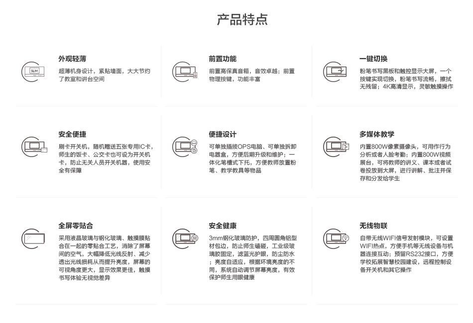 文香超薄智慧黑板在不改變教師使用習(xí)慣的基礎(chǔ)上實(shí)現(xiàn)了傳統(tǒng)黑板教學(xué)與多媒體智慧教學(xué)之間的無縫切換。高清顯示,高亮設(shè)計(jì),超薄機(jī)身,最高支持4K分辨率。超薄智慧黑板采用刷卡開關(guān)機(jī),提高了設(shè)備使用的安全性;鋼化玻璃采用的是超薄防眩光鋼化玻璃,慮光護(hù)眼,健康防塵,安全無銳角;增加了感光模塊,根據(jù)使用的環(huán)境中的光的亮度自動(dòng)調(diào)節(jié)屏幕亮度;插拔式電腦OPS和電器模塊便于安裝和維護(hù)。黑板下方一體化筆槽,教師可將粉筆等放置其中。內(nèi)置視頻展臺(tái)(高拍儀)和攝像頭。