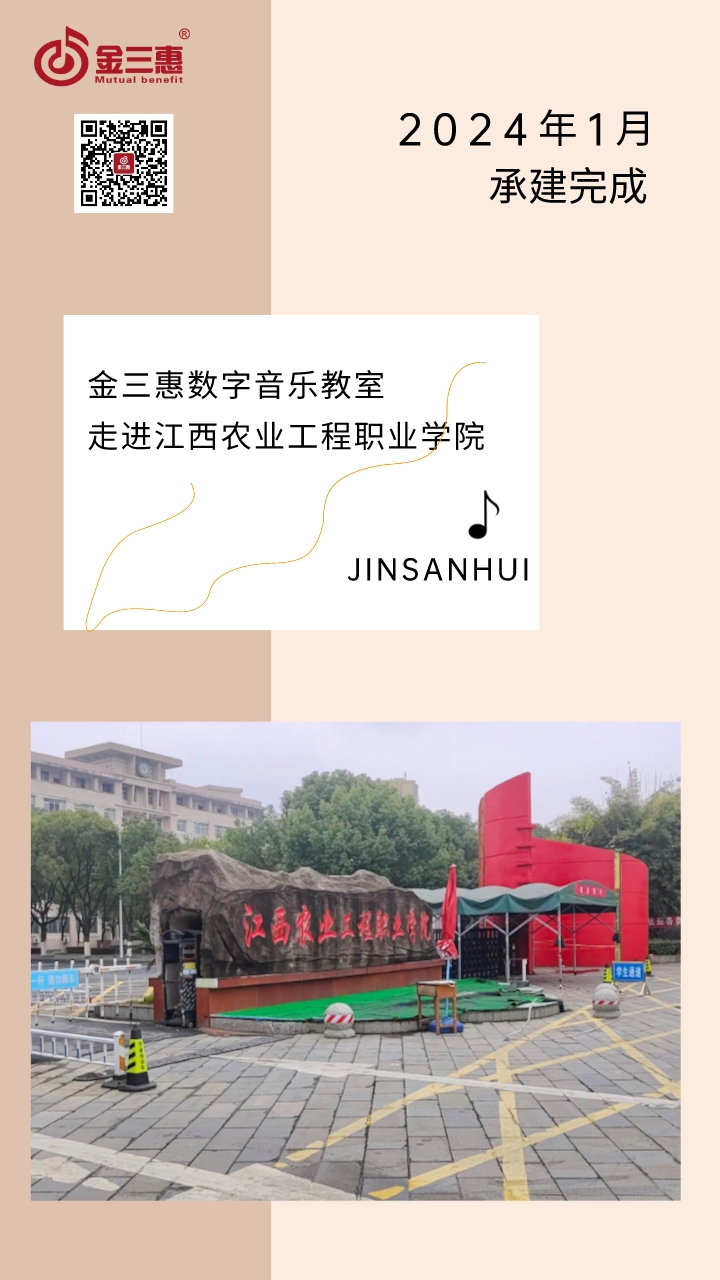 2024年1月,金三惠數(shù)字音樂教室走進(jìn)江西農(nóng)業(yè)工程職業(yè)學(xué)院,為學(xué)校提供了24+1的電鋼琴教室配備了金三惠電鋼琴教學(xué)系統(tǒng)、電鋼琴、數(shù)字音樂教學(xué)儀等教學(xué)教具等。