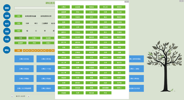 (1)選擇“碑帖”欄目,可以看到有年代、書體、作者等選項(xiàng);