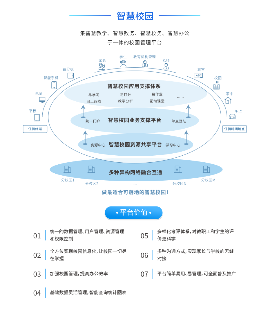 | 智慧校園、紙筆互動(dòng)課堂、智慧排課選課系統(tǒng)(3+1+2、3+3)、職業(yè)生涯規(guī)劃系統(tǒng)、綜合素質(zhì)評(píng)價(jià)系統(tǒng)、網(wǎng)絡(luò)閱卷系統(tǒng)、小測(cè)評(píng)卷管理軟件、先閱后掃系統(tǒng)、教學(xué)質(zhì)量監(jiān)測(cè)與評(píng)價(jià)系統(tǒng)、個(gè)性化學(xué)習(xí)平臺(tái)、資源共享平臺(tái)、教育招生錄取系統(tǒng)、智慧教育云平臺(tái)等產(chǎn)品 |
