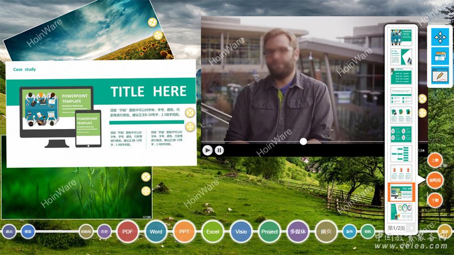 產(chǎn)品詳細(xì)介紹 “HoinWare專業(yè)多媒體互動(dòng)教學(xué)軟件”Windows版是一款專門為多點(diǎn)觸摸屏設(shè)計(jì)研發(fā)的專業(yè)交互軟件,適合教學(xué)、會(huì)議、展覽展示場景的文檔和多媒體交互和展示,集多種先進(jìn)交互技術(shù)、人機(jī)交互設(shè)計(jì)理念、高效率算法于一身,可同時(shí)支持MS-PPT、MS-WORD、MS-EXCEL、MS-Visio、MS-Project、PDF、高清圖片視頻、網(wǎng)頁9大多媒體內(nèi)容的智能識別和多點(diǎn)觸摸互動(dòng), 并支持多文檔同時(shí)展示、標(biāo)注、文檔高速切換以及縮略圖分頁導(dǎo)航,無縫讀取高拍儀或攝像頭圖像等強(qiáng)大的功能, 且無需安裝第三方軟件?膳c目前主流的液晶/投影電子白板、觸控一體機(jī)、納米觸控黑板、觸控茶幾等互動(dòng)設(shè)備無縫匹配。