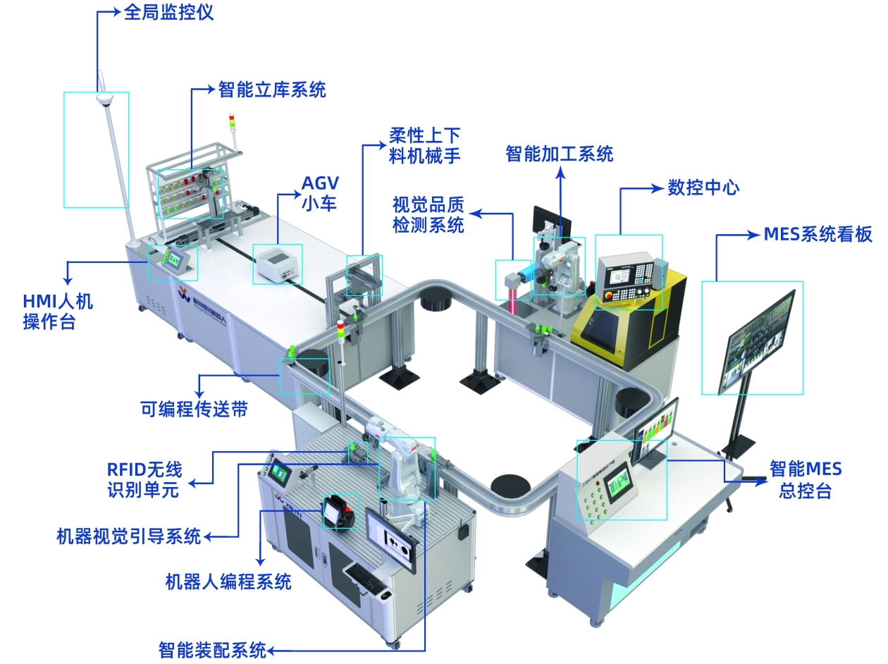 產(chǎn)品各組成單元 MES制造執(zhí)行系統(tǒng)在未來的工業(yè)4.0工廠里,智能設備、智能產(chǎn)品與智能管理系統(tǒng)相互交流,并與ERP、PLM、云數(shù)據(jù)等進行通信聯(lián)絡,構(gòu)成一個巨大的通信網(wǎng)絡。維視工業(yè)4.0 MES系統(tǒng)基于數(shù)據(jù)庫技術(shù),生產(chǎn)線的信息傳送過來后都存在系統(tǒng)的數(shù)據(jù)庫中,MES通過訪問數(shù)據(jù)庫對信息進行處理和展示。同時我們還可以實現(xiàn)MES與ERP的對接以及其它系統(tǒng)的對接,實現(xiàn)更大面的信息共享。 智能立體倉庫按實際立體倉庫工作原理設計,包括貨架、堆垛車、輸送線等部分,組成縮合性自動化實訓平臺。 ● 傳感器技術(shù) ● 人機介面 ● PLC控制 ● 電機驅(qū)動技術(shù) ● 伺服系統(tǒng) ● Rfid技術(shù) ● 氣動系統(tǒng) ● Wifi通信 ● 真空系統(tǒng) ● 標準接口 智能機器人裝配智能AGV機器人配合自動料盒更換裝置,加上智能立體倉庫實現(xiàn)完全智能的物流倉儲功能。機器人技術(shù)應用是未來工廠里的重要內(nèi)容,智能機器人裝配工站將機器人、機器視覺、PLC等集成在一起,構(gòu)成了一套全自動化的智能生產(chǎn)系統(tǒng)。 ● 工業(yè)機器人 ● 電機控制 ●傳感器 ● 夾具設計 ● 機器視覺 ● 機器人焊接 ● 安全保護 ● 氣動系統(tǒng) 智能加工MES是整個智能工廠的大腦,是收集信息、加工信息、處理信息的地方,通過與生產(chǎn)硬件的配合,實現(xiàn)智能化的生產(chǎn)過程。在未來工廠內(nèi),智能化的加工設備通過與產(chǎn)品通信,得到產(chǎn)品需要加工的內(nèi)容,自動按照要求的加工內(nèi)容進行定制化加工,這樣的場景在這里也得到了展現(xiàn)。 ● 智能激光打標加工 ● wifi通信 ● 網(wǎng)絡通信 ● 個性化加工 ● RFID