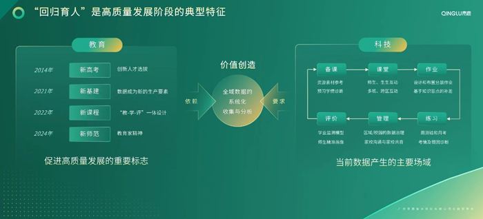 青鹿認(rèn)為,當(dāng)前教育數(shù)字化轉(zhuǎn)型進(jìn)入價(jià)值創(chuàng)造階段,這一階段的目標(biāo)將更貼近回歸教育的育人本質(zhì),并以“全域數(shù)據(jù)的系統(tǒng)化收集與分析”為重要表征,聚焦數(shù)據(jù)賦能因材施教的實(shí)現(xiàn)。