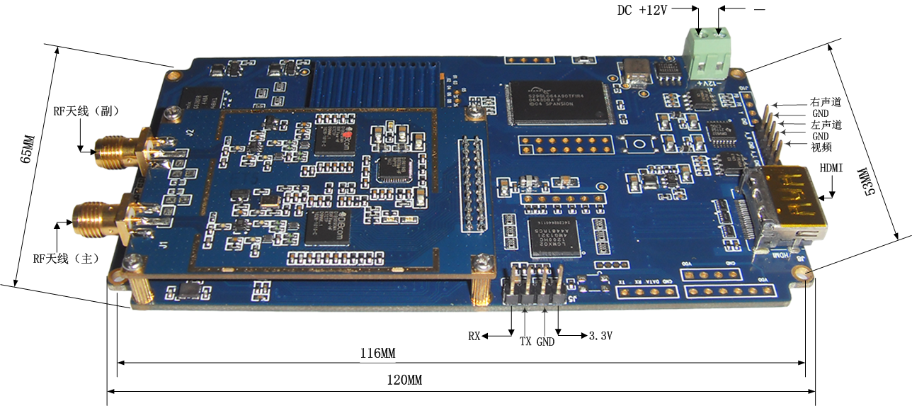 2.2.2、接收端 射頻解調(diào)部分 接收頻率: 200MHz~850MHz 解調(diào)技術(shù): COFDM 信道帶寬: 2/2.5/4/8MHz 加密方式: 數(shù)字組合AES加密 RF接口: SMA母頭 接收靈敏度: 8MHz@-97dBm 信號強弱: 接收信號百分比強弱液晶指示 系統(tǒng)部分 接收極化: 垂直極化,雙天線接收,1主天線,1輔助天線 接收技術(shù): 空間分集接收技術(shù) 音視頻部分 解壓格式: H.264/MPEG-2 模擬視頻輸出: PAL/NTSC 模擬音頻輸出: 左右聲道 數(shù)字音視頻輸出: HDMI 圖像清晰度: 模擬:WD1\D1 數(shù)字:HD1080I、兼容其下分辨率 其它部分 自帶LCD液晶顯示、調(diào)節(jié)參數(shù)、接收信號強弱指示 供電: DC 12±3V @ 0.3A 外形尺寸: 120*65*10mm |
