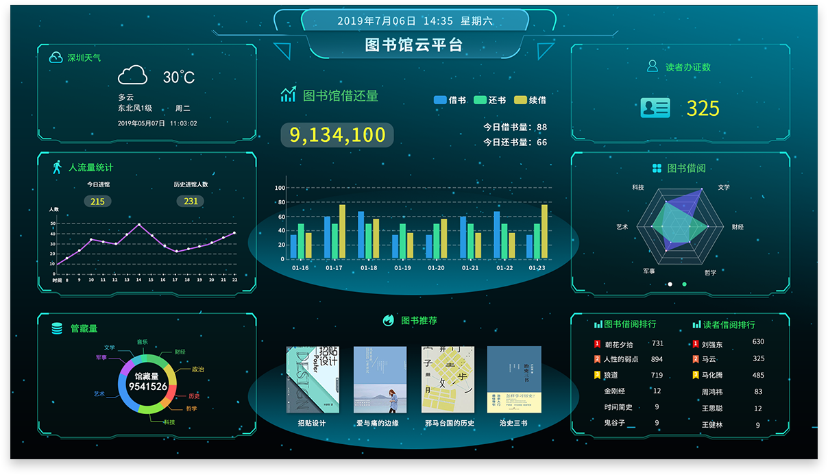 產(chǎn)品詳細(xì)介紹1.實時展示圖書館的業(yè)務(wù)數(shù)據(jù),包括今日圖書借還量、館藏數(shù)量、到館人次等等(展示內(nèi)容可調(diào)整)。