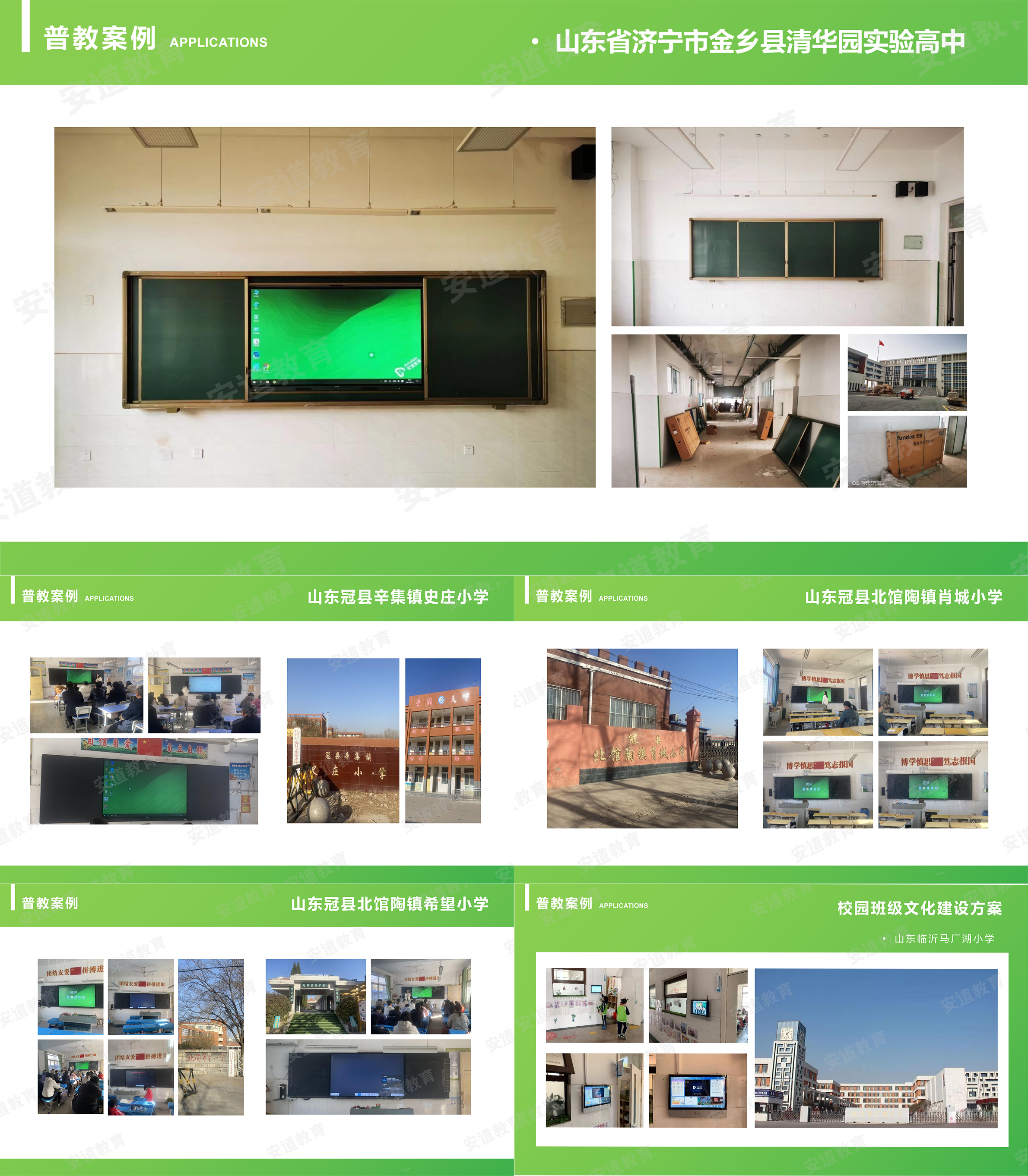 韓夢思詳細介紹了安道教育在山東地區(qū)的實施案例。例如:山東濟寧市金鄉(xiāng)縣清華園實驗高中的智慧黑板項目、山東臨沂馬廠湖小學(xué)的校園班級文化建設(shè)方案、山東冠縣北館陶鎮(zhèn)肖城小學(xué)/斜店中心小學(xué)/辛集鎮(zhèn)史莊小學(xué)的智慧黑板項目等。