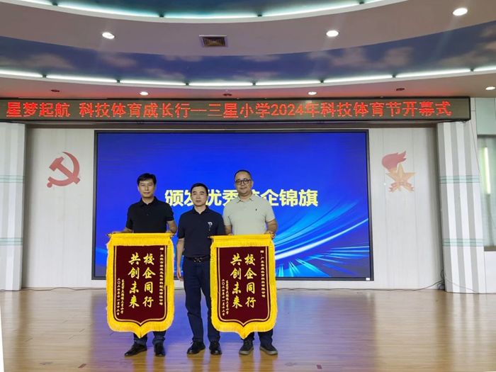 發(fā)表演講后,三星小學有關領導向安道教育贈送錦旗并合影留念。隨后,共同觀看了文藝表演。