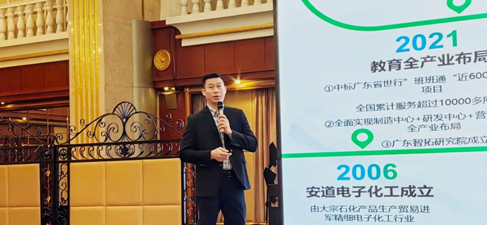 結(jié)合廣西市場工作及案例,安道教育廣西區(qū)域銷售經(jīng)理譚丹杰展示了安道教育一些列產(chǎn)品創(chuàng)新成果,包括智慧教育終端產(chǎn)品、應(yīng)用軟件和全場景解決方案等。他在《軟硬結(jié)合,全力打造教育智能化新生態(tài)》主題演講中展示了榮獲”信創(chuàng)適配性創(chuàng)新技術(shù)“獎(jiǎng)的智能交互平板S4系列、智慧黑板Q系列等教學(xué)終端設(shè)備,這些產(chǎn)品可覆蓋在各個(gè)不同的教學(xué)場景中,為K12和高職校的智慧教室建設(shè)提供了多樣化的選擇。