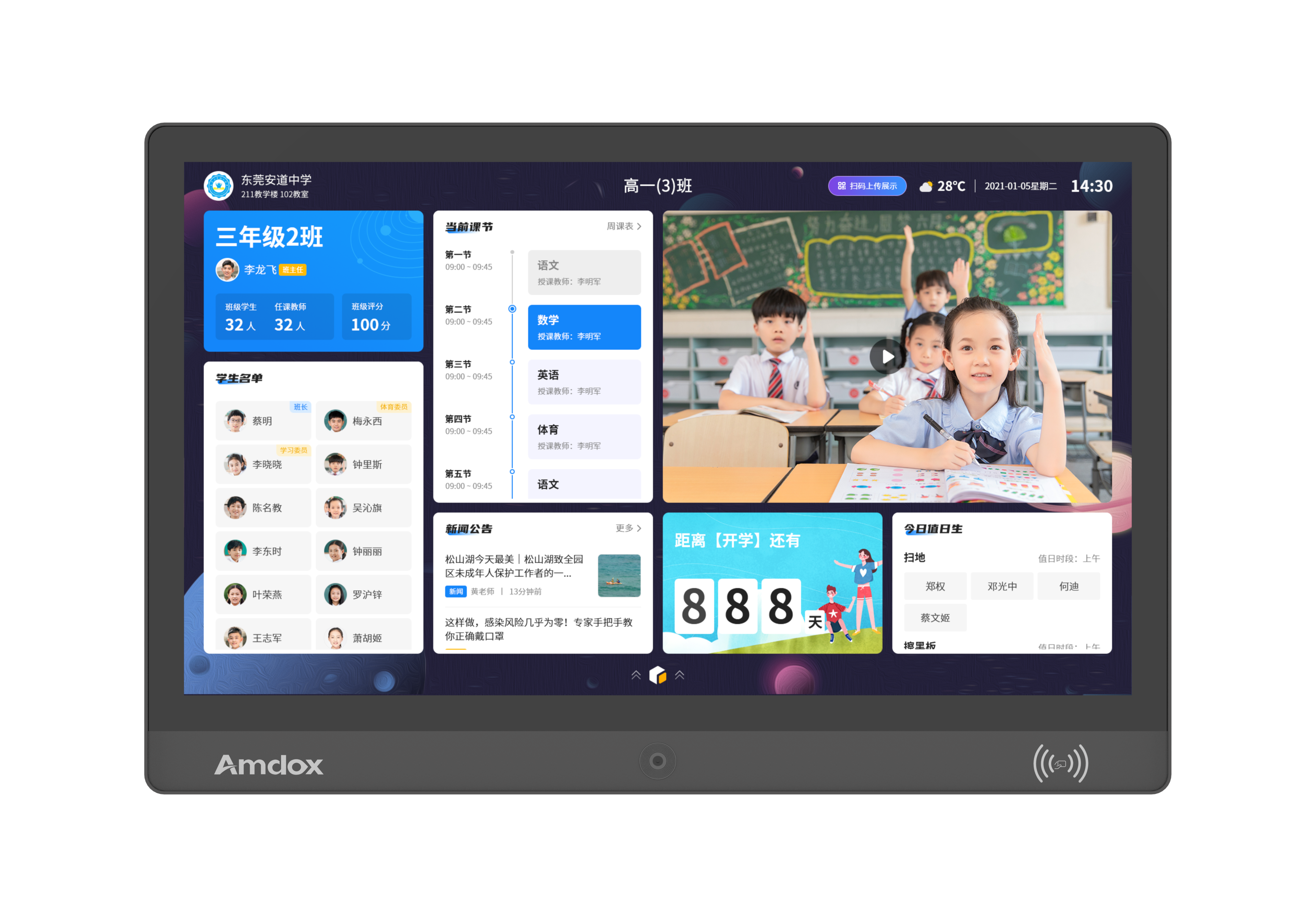 安道云班牌是安道教育自研專(zhuān)為學(xué)校打造的校園文化建設(shè)、班級(jí)考勤、班級(jí)信息展示的信息化產(chǎn)品,具有展示校園文化、班級(jí)文化、學(xué)校安全教育、班級(jí)考勤、課程安排、活動(dòng)資訊、通知信息等輔助教學(xué)功能,搭建家校溝通橋梁,促進(jìn)家校共育。