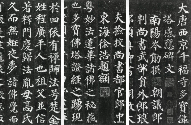 《多寶塔碑》用筆豐厚遒美,腴潤(rùn)沉穩(wěn);橫細(xì)豎粗,對(duì)比強(qiáng)烈;結(jié)體嚴(yán)謹(jǐn)致密,緊湊規(guī)整,平穩(wěn)勻稱。學(xué)顏體者多從此碑入手,入其堂奧。