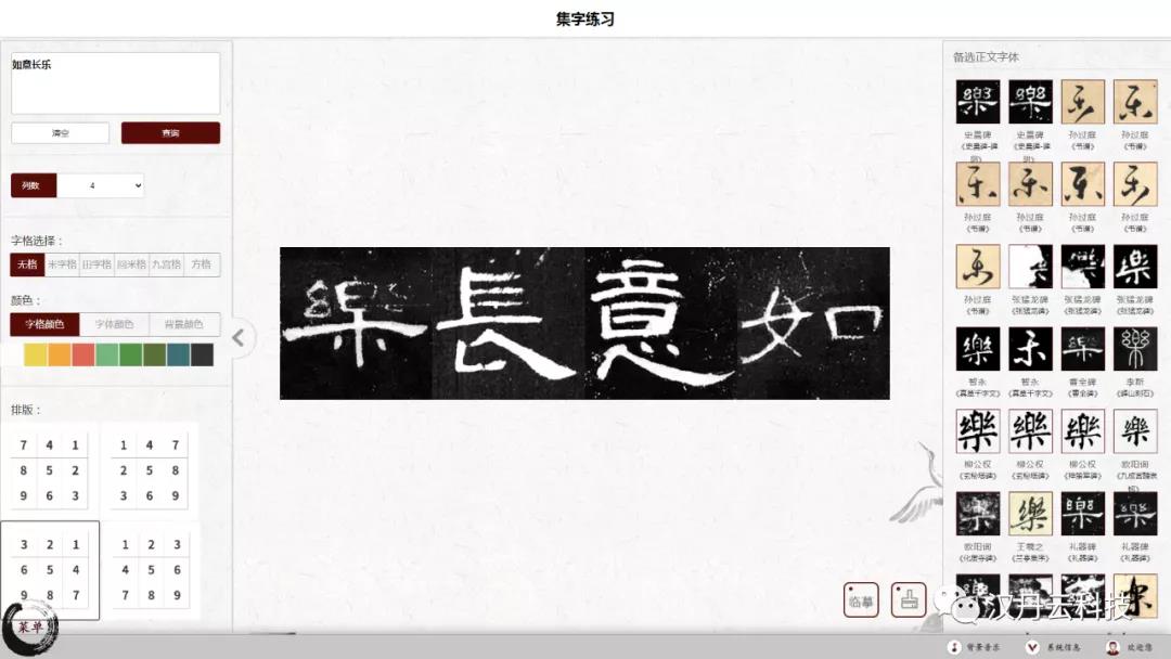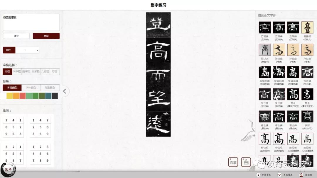 漢丹云智慧書法教室軟件能夠根據(jù)用戶需求,任意選調(diào)《曹全碑》中的例字,并將其按照需要的版式,1-16字選擇排版,當(dāng)場形成書寫字帖,在桌面電腦上可觀賞可臨寫可描摹十分方便!