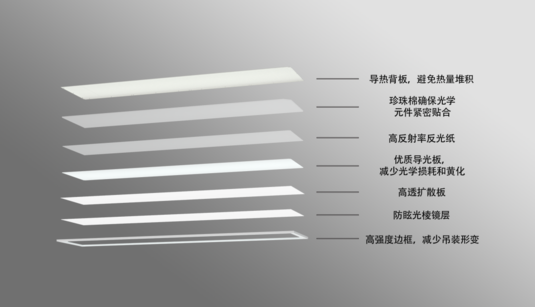 宜美照明優(yōu)選7種材料,采用科學(xué)設(shè)計(jì),從根源解決健康照明問題。在燈具底層,使用了導(dǎo)熱背板,可避免熱量堆積,減少安全隱患;背板上,珍珠棉能確保光學(xué)元件緊密貼合,防止光線漏出;然后是高反射率反光紙,可在增加光源利用率的同時(shí),減少眩光的產(chǎn)生;在LED燈珠下,使用優(yōu)質(zhì)導(dǎo)光板,可減少光學(xué)損耗和黃化;在導(dǎo)光板下,還采用高透擴(kuò)散板和防眩光棱鏡層,可有效減少眩光的形成;燈具外還采用高強(qiáng)度邊框,可減少吊裝變形,延長(zhǎng)使用壽命。
