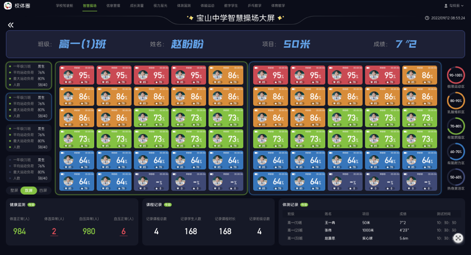 運(yùn)動(dòng)數(shù)據(jù)分析、運(yùn)動(dòng)直播課、運(yùn)動(dòng)榮譽(yù)墻、測(cè)試錄像回看等應(yīng)用的智能體育教育大屏,智慧屏即時(shí)展現(xiàn)各種體質(zhì)測(cè)試數(shù)據(jù)、擁有豐富而強(qiáng)大的體育教學(xué)資源和即時(shí)性。