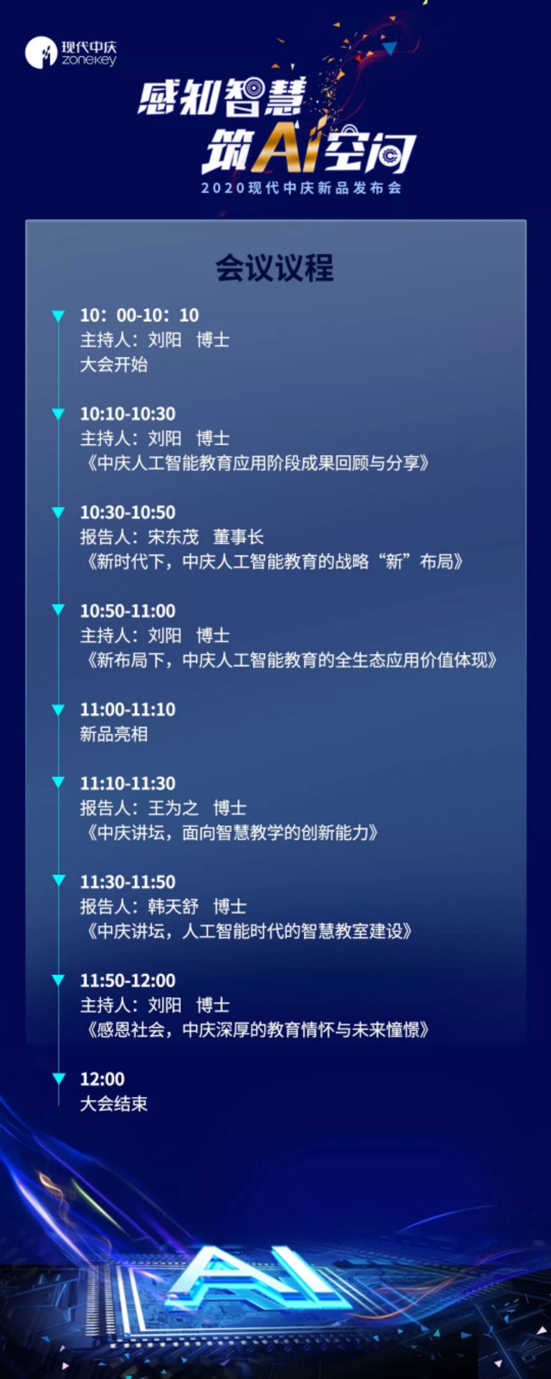 2020年6月20日,中慶將正式面向教育用戶發(fā)布五款智能終端產(chǎn)品,全面開(kāi)啟人工智能教育應(yīng)用的新篇章。“感受智慧,筑AI空間”2020現(xiàn)代中慶新品發(fā)布會(huì),誠(chéng)邀您的光臨。