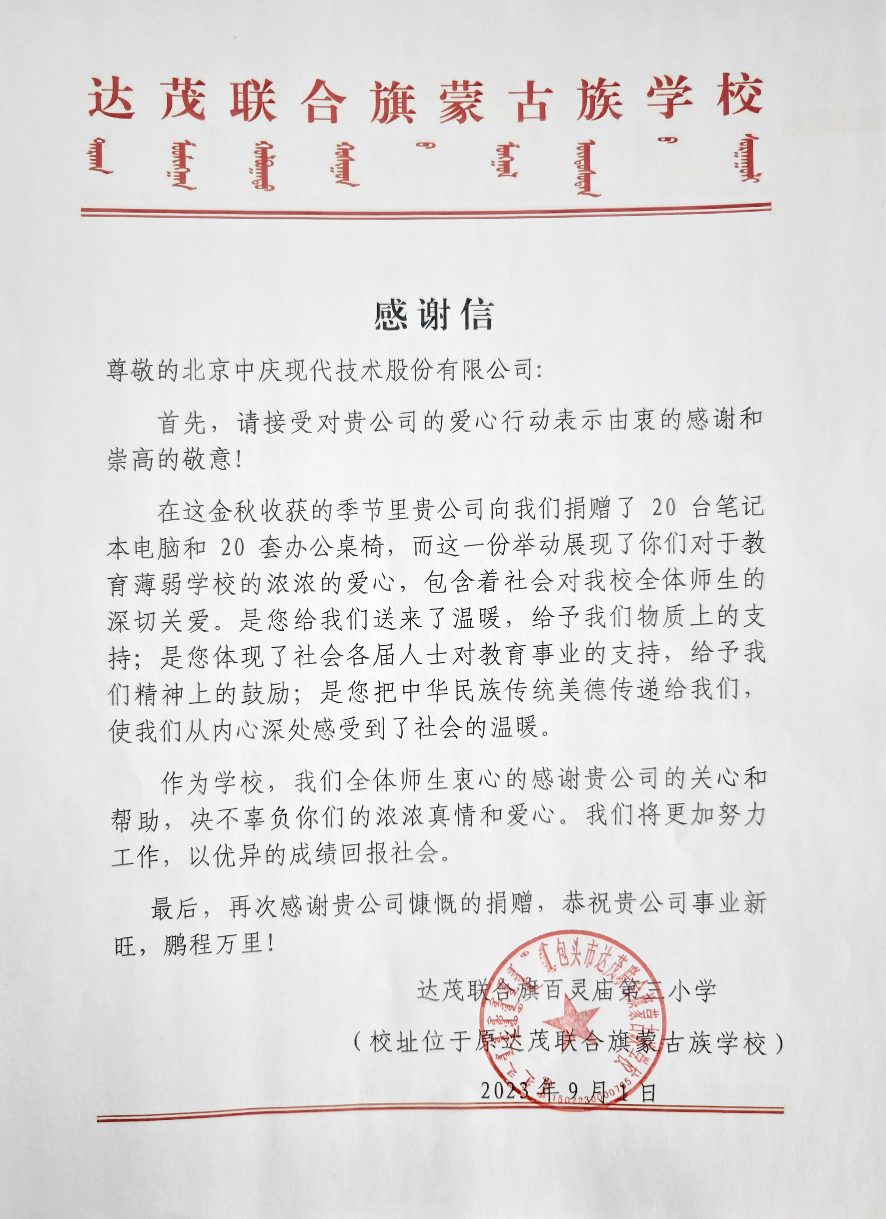達(dá)茂聯(lián)合旗蒙古族學(xué)校的感謝信