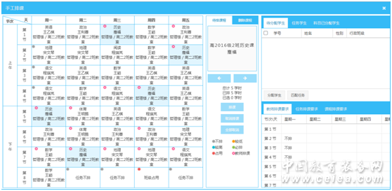 課程信息完善后,所有的數(shù)據(jù)都會在排課系統(tǒng)內(nèi),按照設置的各種條件進行自動排課,采用自主研發(fā)的人工智能算法,預先分析現(xiàn)有資源能否滿足排課,不滿足則給出提示,滿足則進行排課,最終完成整個選課—分班—排課操作。對課程還可以進行“手工”調(diào)整和排課。