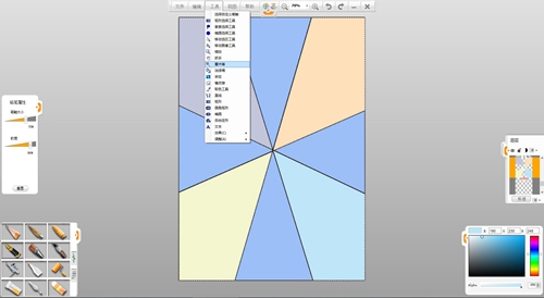 7.先使用工具菜單下的魔術(shù)棒工具選擇一個(gè)區(qū)塊,然后在新建的透明圖層中使用油漆桶工具為其上色。依次將四個(gè)不同顏色的區(qū)塊填好色。
