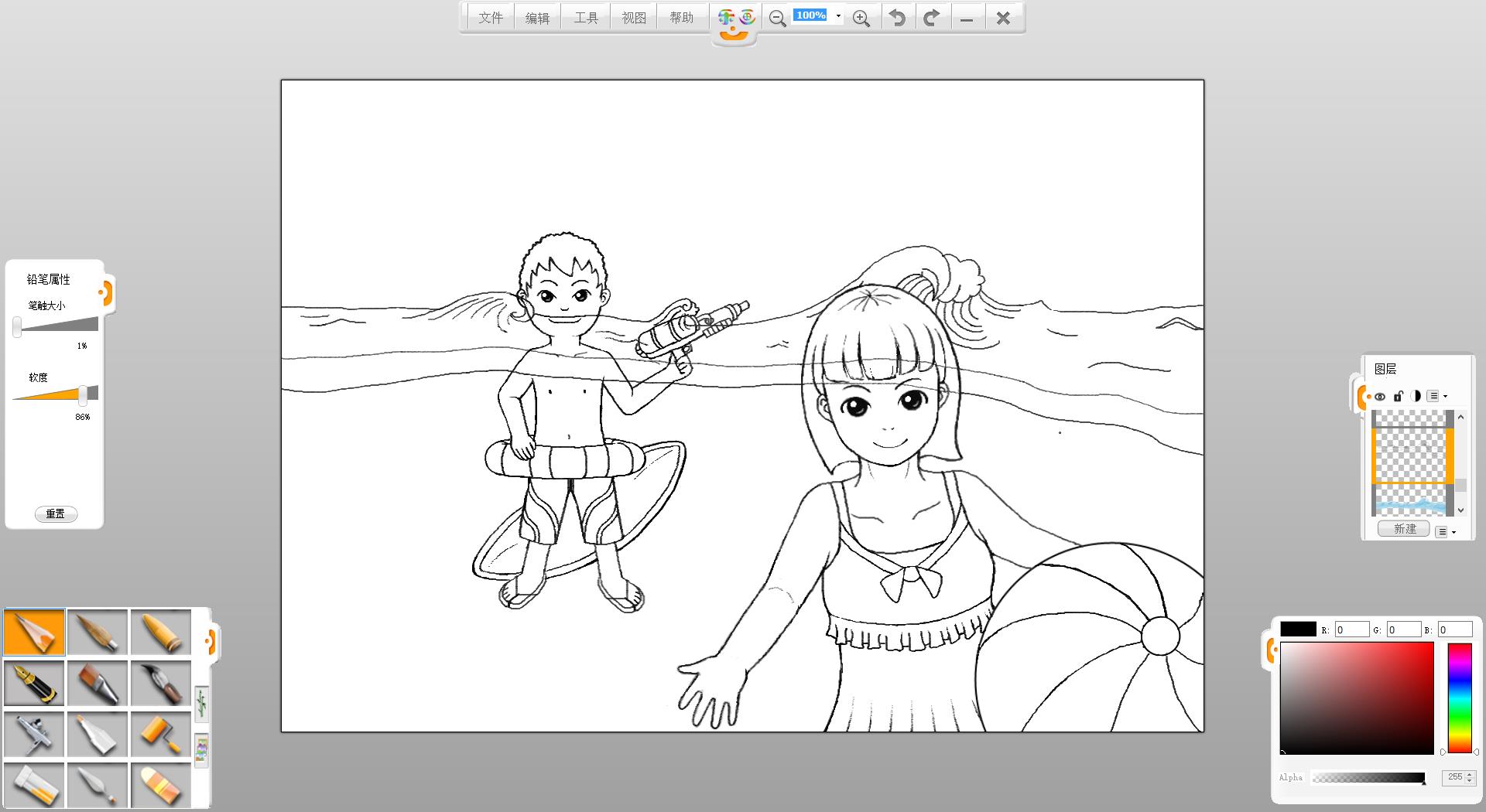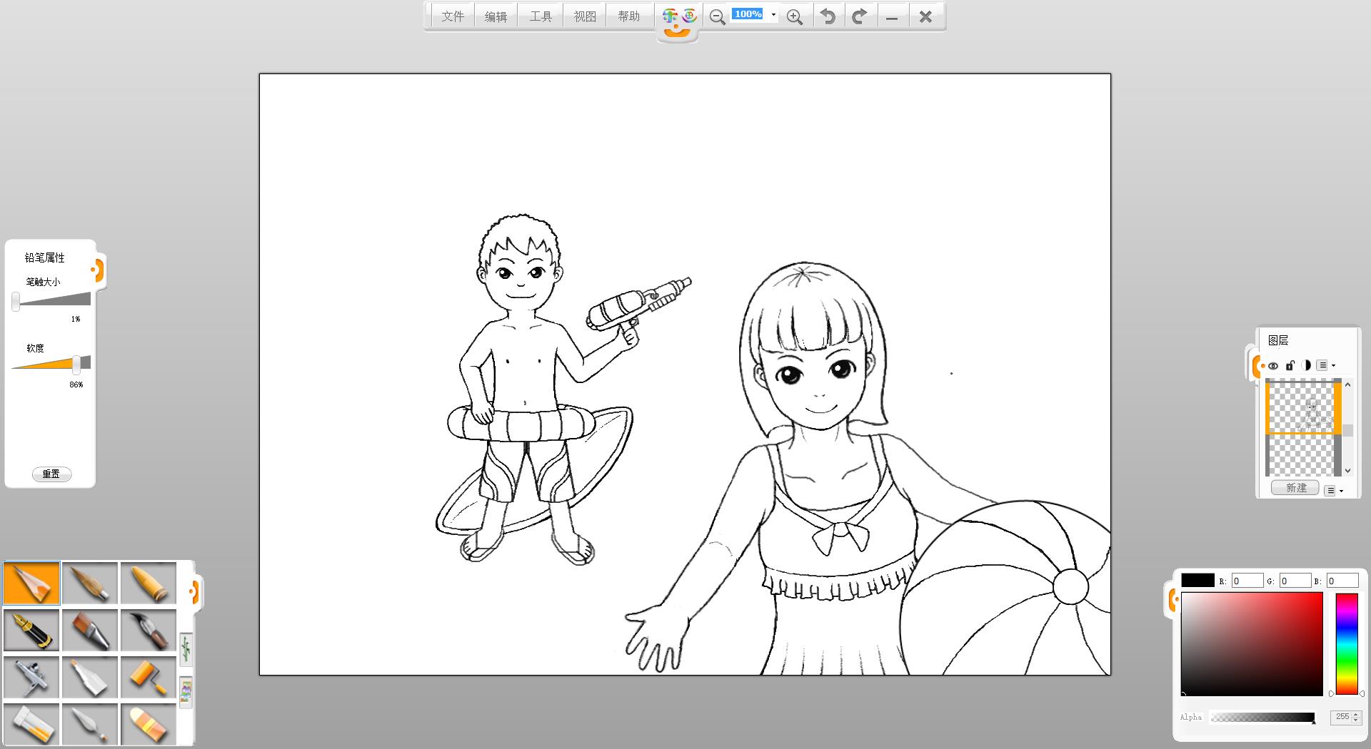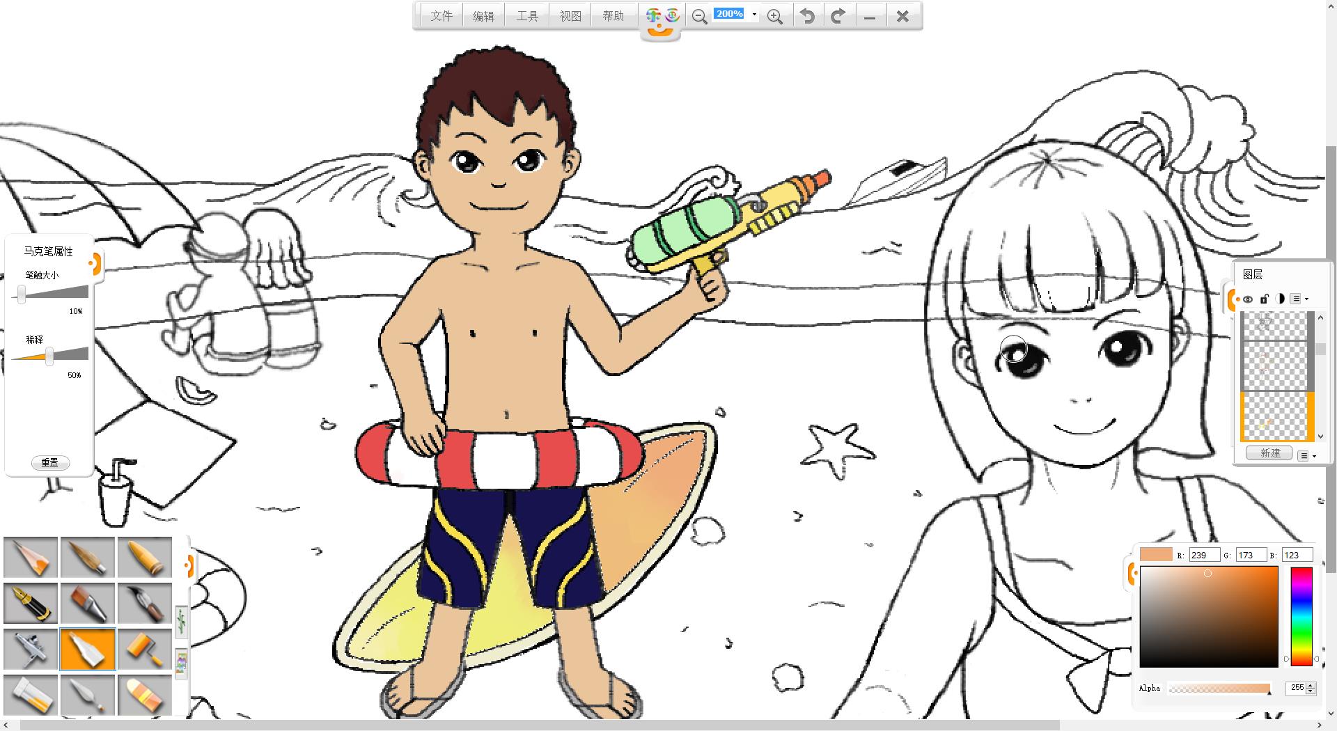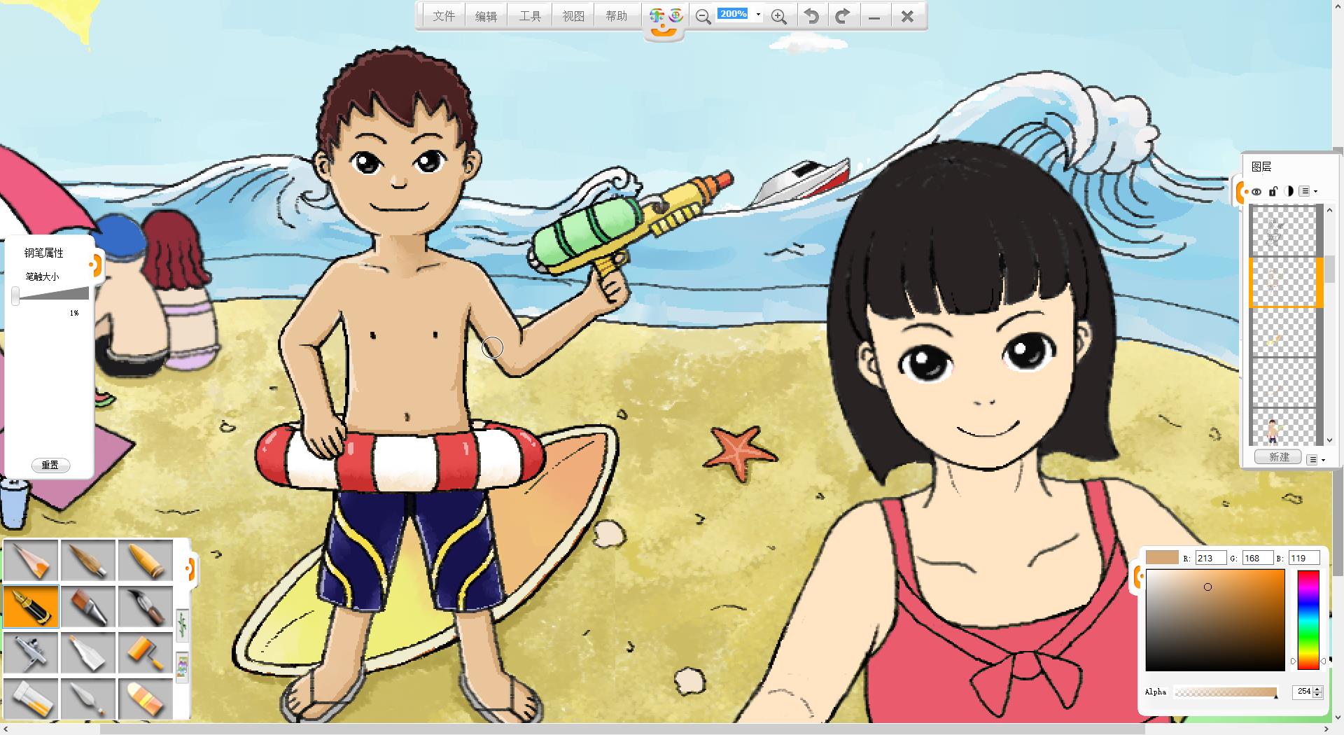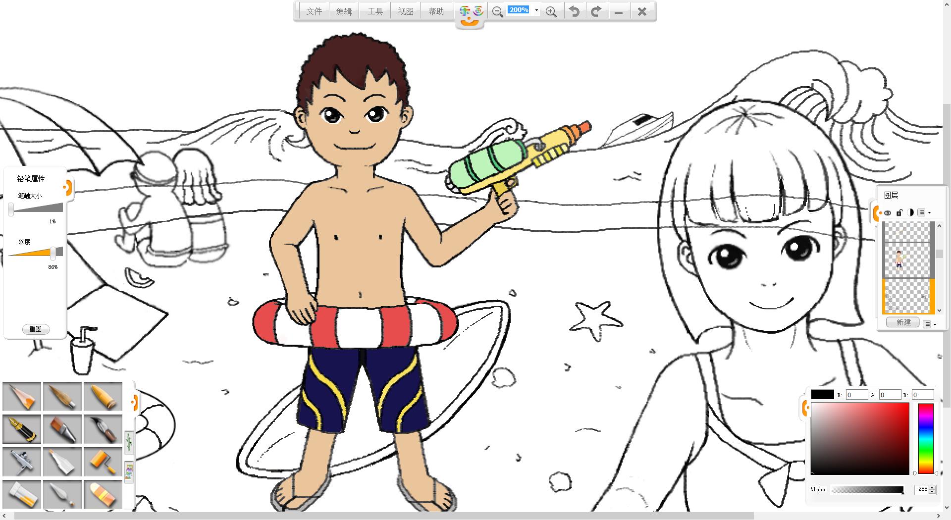 4.使用鉛筆筆觸繪制一個(gè)拿水槍的泳裝男孩形象。
