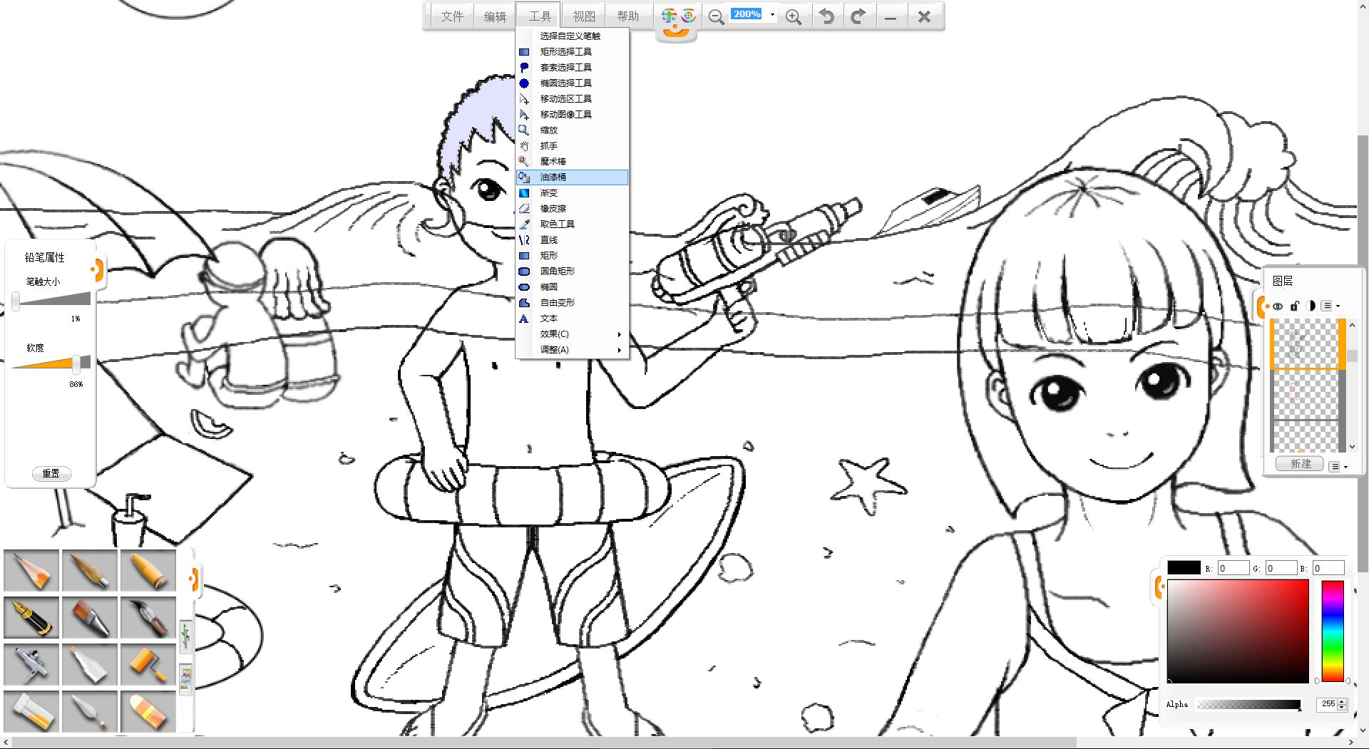 8.打開工具菜單。使用魔術(shù)棒工具選定閉合區(qū)域后,用油漆桶工具為人物鋪上底色。