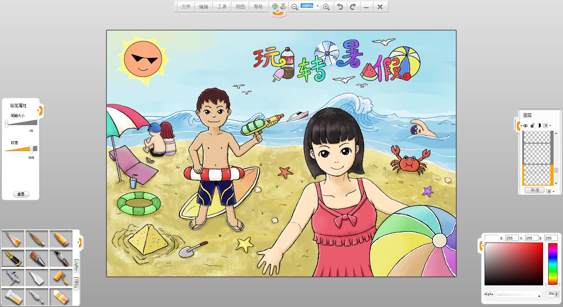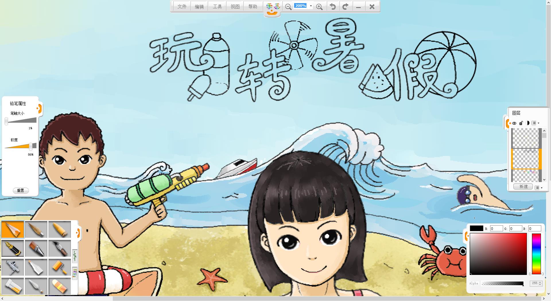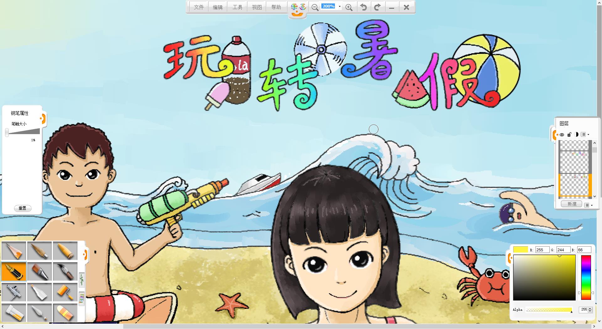 26.一幅“玩轉(zhuǎn)暑假”的作品創(chuàng)作完成了,如果有時(shí)間還可以給人物更換不同的發(fā)型和服裝。