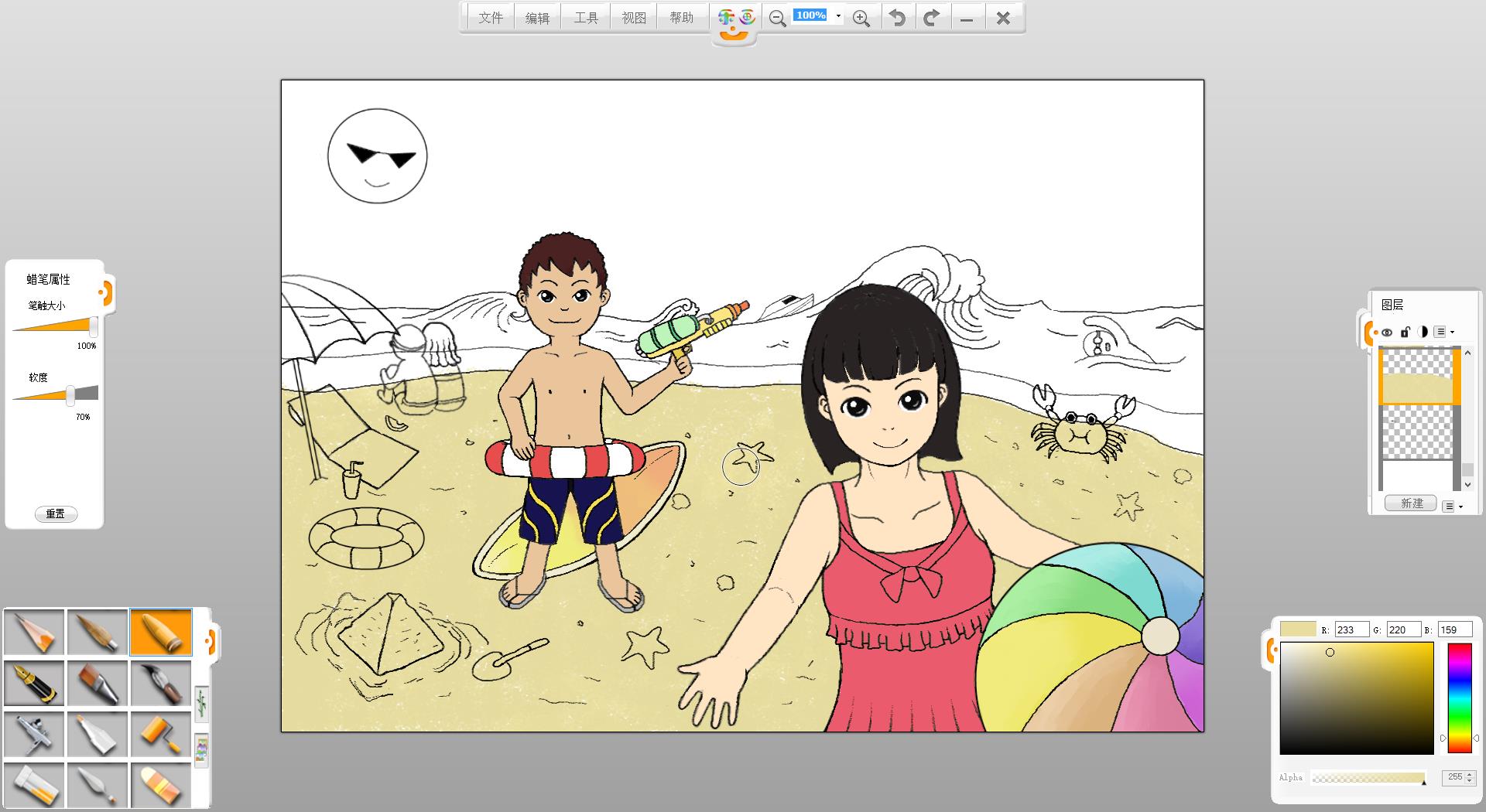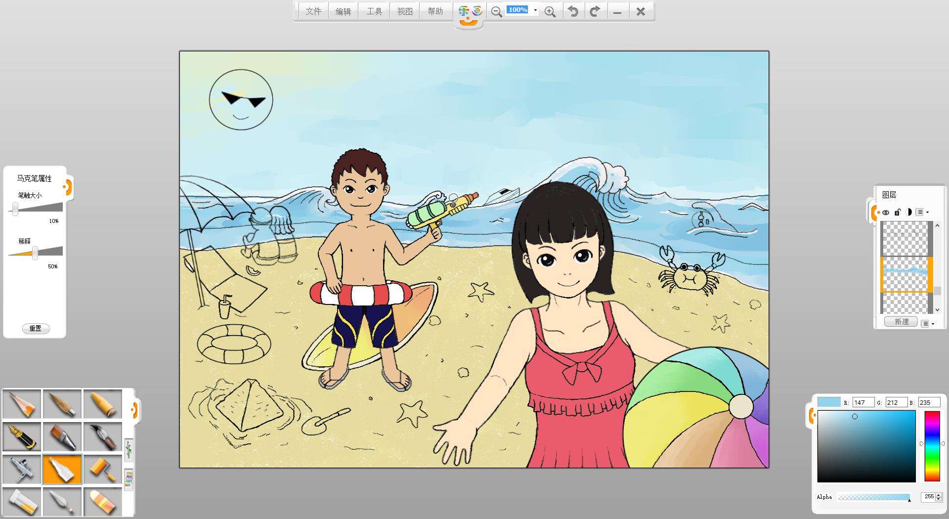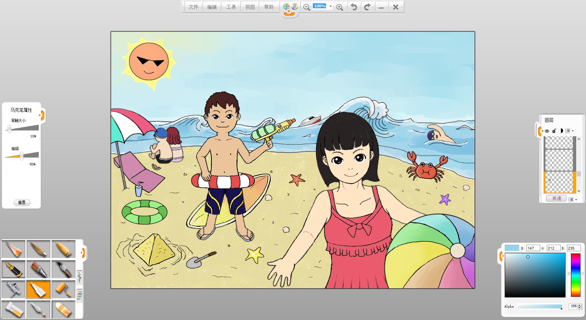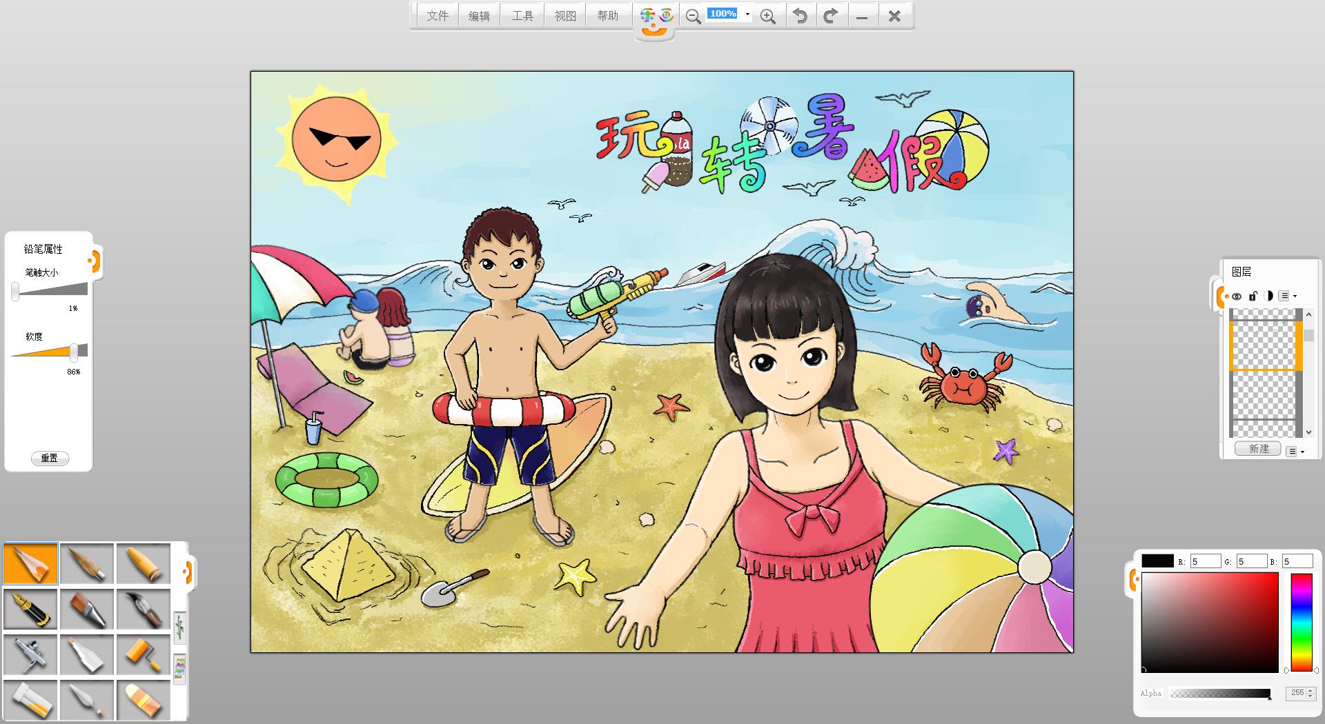 暑假到了,假期準(zhǔn)備如何度過呢?去海灘游玩是一個(gè)不錯(cuò)的選擇,F(xiàn)在來嘗試創(chuàng)作一幅“玩轉(zhuǎn)暑假”的作品吧!