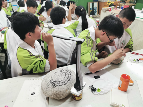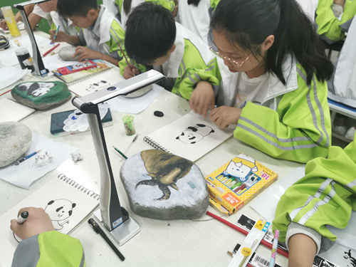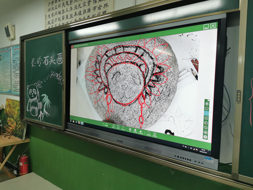 在熊貓石頭畫美術課上,師生們正在使用吉星捐贈的未來智慧美術全互動系統(tǒng)進行美術教學。