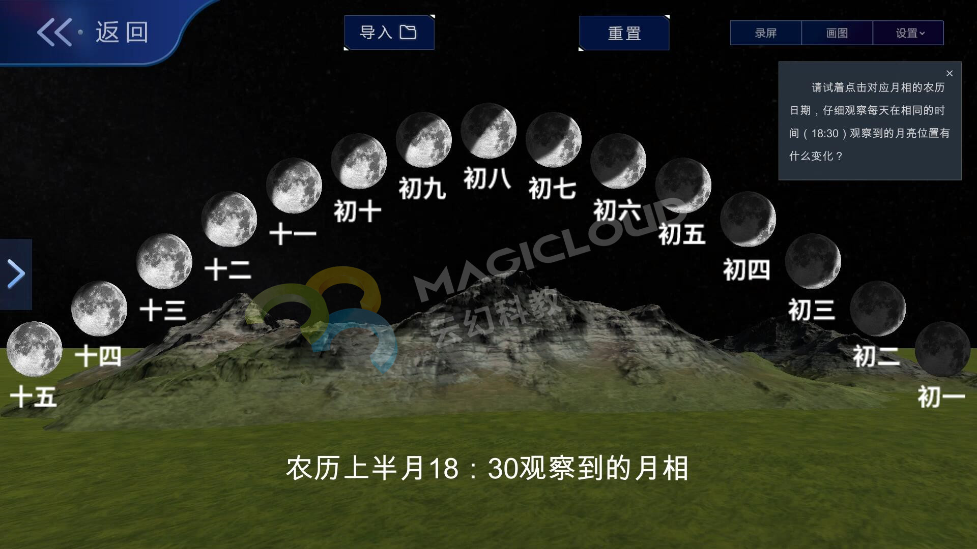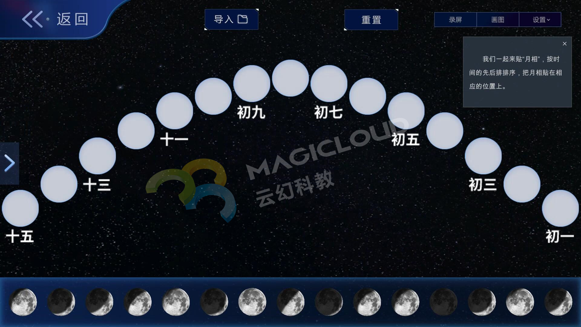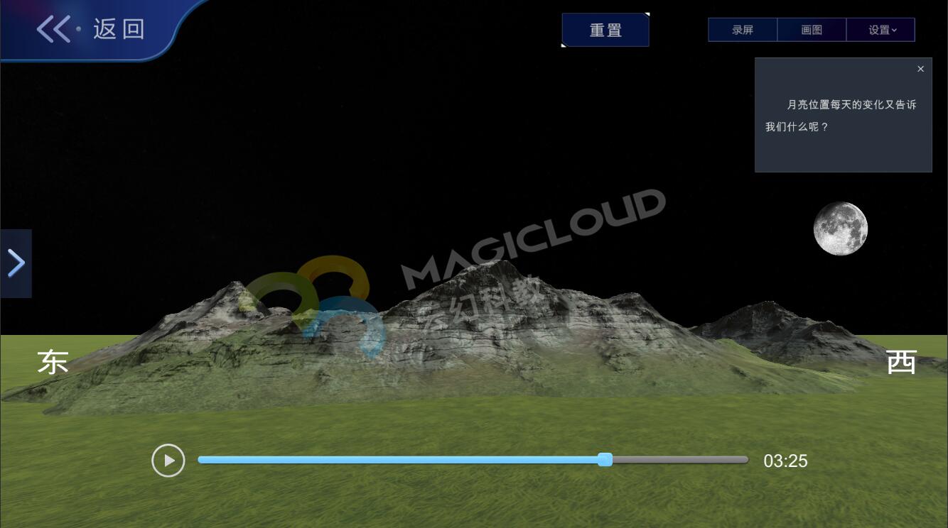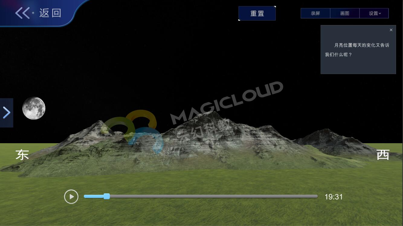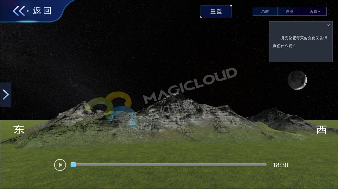 云幻科教AR科學(xué)仿真實(shí)驗(yàn)平臺(tái)月相變化板塊設(shè)計(jì)分為月相變化的原因、給月相排序、探索月相變化、觀察晚上的月相、小試牛刀、拓展應(yīng)用六個(gè)板塊,在常規(guī)教學(xué)的基礎(chǔ)上進(jìn)行擴(kuò)充,全面覆蓋月相變化教學(xué)內(nèi)容,為教師教學(xué)提供豐富的素材。