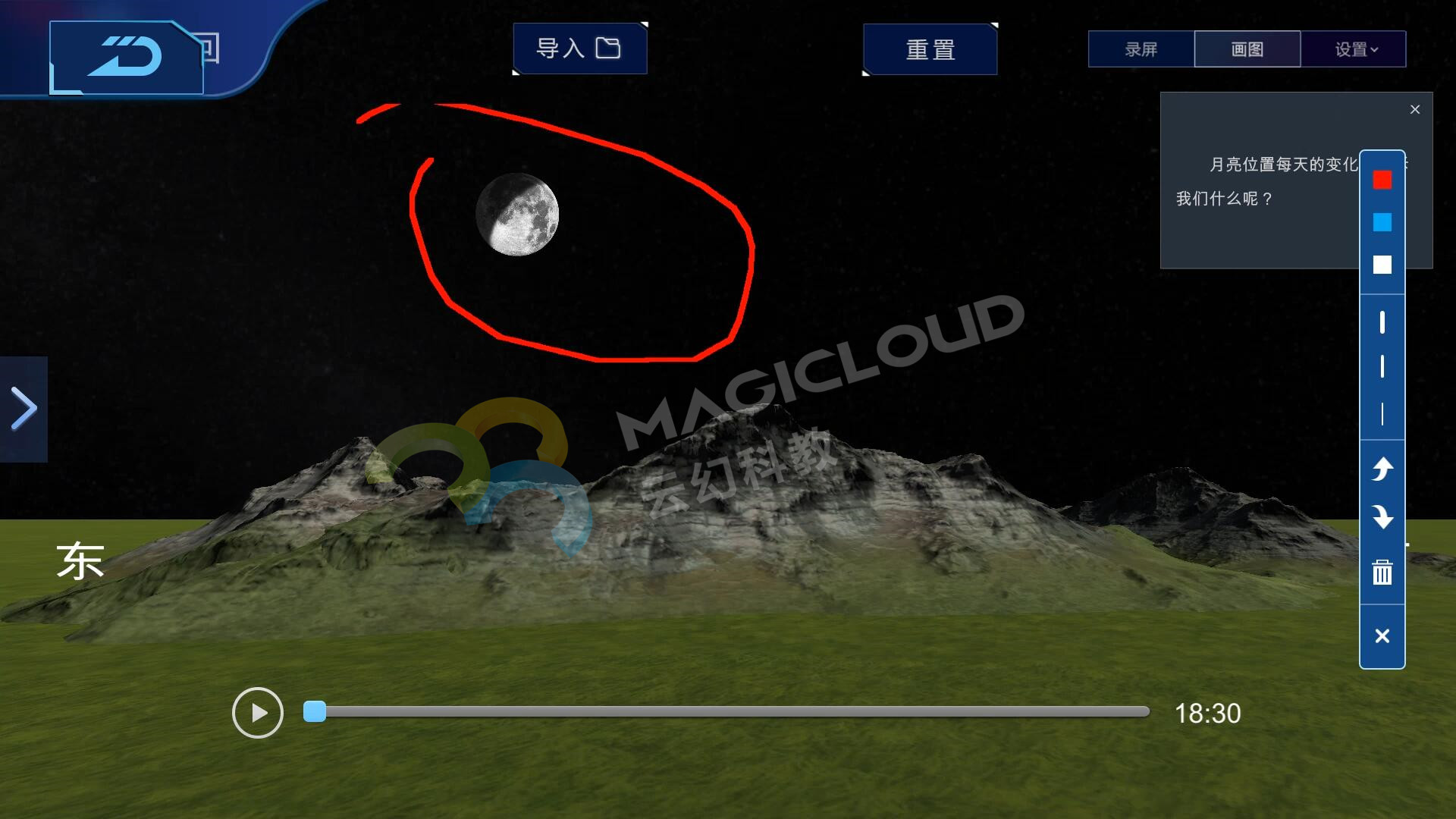 在常規(guī)教學(xué)中,一般教學(xué)環(huán)節(jié)為畫月相、給月相排序、模擬月相變化、觀察白天的月相等。教學(xué)環(huán)節(jié)中會(huì)遇到一些問題,如所畫月相是否正確、天氣影響無(wú)法觀察月相、觀察周期較長(zhǎng)等等。云幻科教AR科學(xué)仿真實(shí)驗(yàn)平臺(tái)可以融入常規(guī)課堂教學(xué)環(huán)節(jié),讓課堂教學(xué)變得更豐富、更有趣。