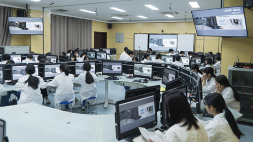 2019年10月31日,廣東省食品藥品職業(yè)技術學校的學生們像往常一樣進行實訓課程教學。但與以往普遍職校實訓教學不一樣的是,老師和少部分學生在實訓室上課,大部分學生在智慧課室上課,老師在實訓室對設備結構和操作進行講解,學生在互動智慧課室通過座位前的屏幕觀看老師上課。聽課的老師們則在另外的觀課室對課程進行全程的觀摩。