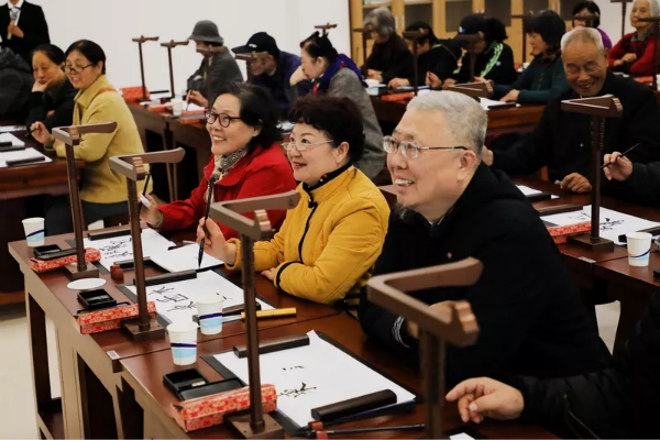 在智慧書法教室,老同志們饒有興致地提筆行文,感受現(xiàn)代科技賦予古典書法藝術的新體驗。當看到筆法演示和個人作品實時傳輸至大屏幕時,老同志們對高超的科技、先進的設備贊不絕口。