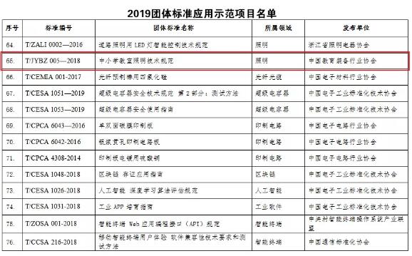 12月18日,中華人民共和國工業(yè)和信息化部發(fā)布《工業(yè)和信息化部關(guān)于公布2019年團體標(biāo)準(zhǔn)應(yīng)用示范項目名單的通告》,為大力培育發(fā)展團體標(biāo)準(zhǔn),支持團體標(biāo)準(zhǔn)的推廣應(yīng)用,共遴選103項2019年團體標(biāo)準(zhǔn)應(yīng)用示范項目。由中國教育裝備行業(yè)協(xié)會發(fā)布,立達(dá)信提出并牽頭制定的團體標(biāo)準(zhǔn)T/JYBZ 005-2018《中小學(xué)教室照明技術(shù)規(guī)范》入選其中。
